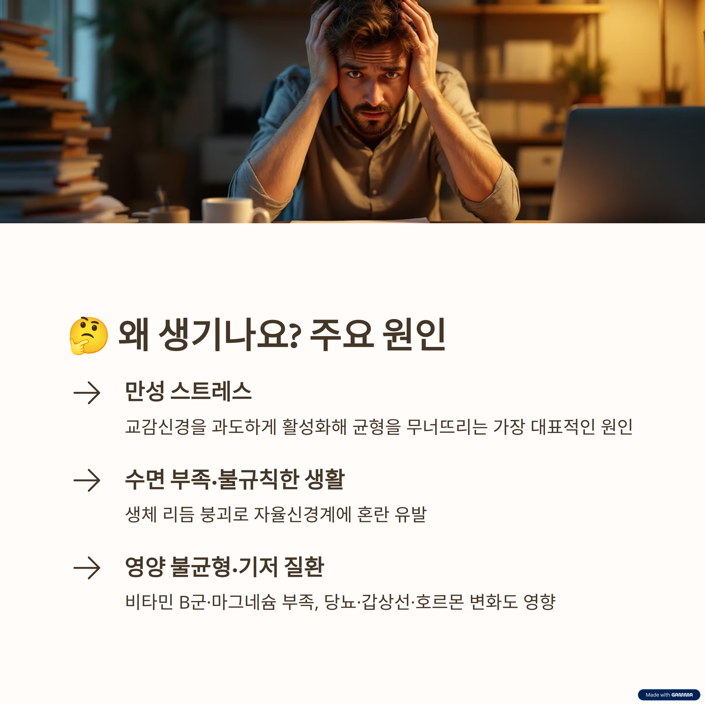 - 만성 스트레스, 수면 부족, 불규칙한 생활 습관이 주요 원인이에요.