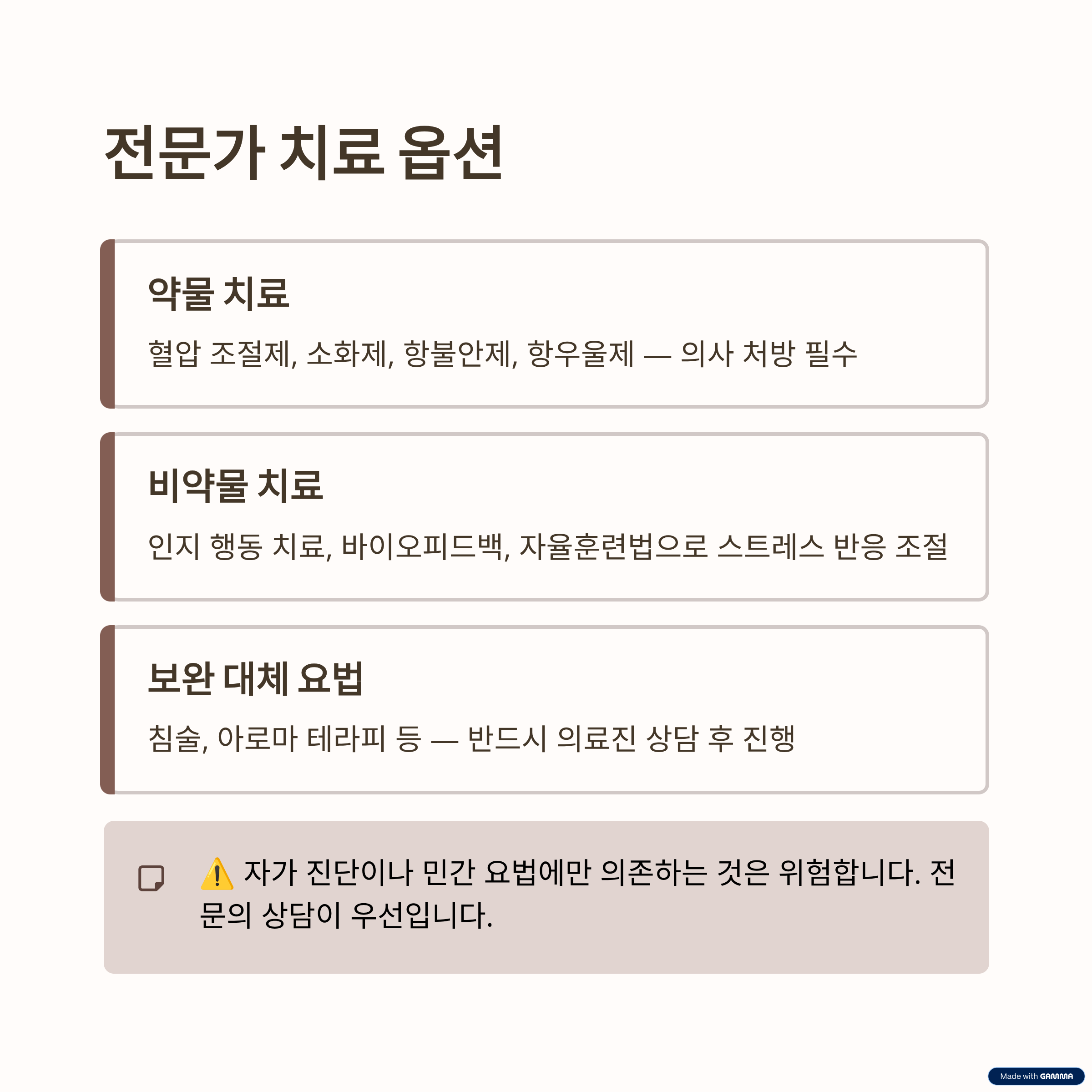 - 약물 치료: 증상 완화를 위해 혈압 조절제, 소화제, 항불안제, 항우울제 등이 처방될 수 있습니다. 이는 의사의 정확한 진단에 따라야 해요.