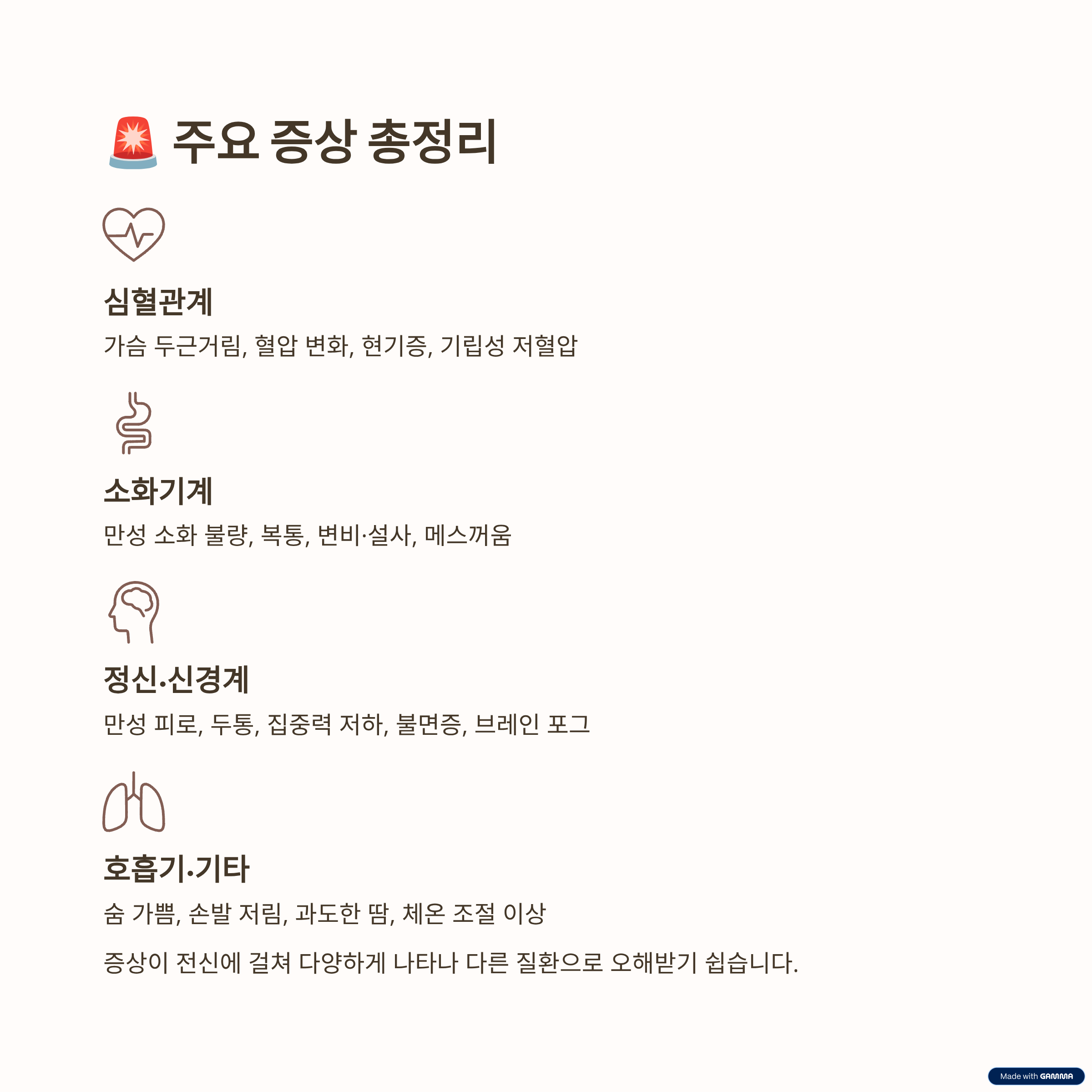 - 심장 두근거림, 소화 불량, 만성 피로, 어지럼증 등 다양한 증상으로 나타납니다.