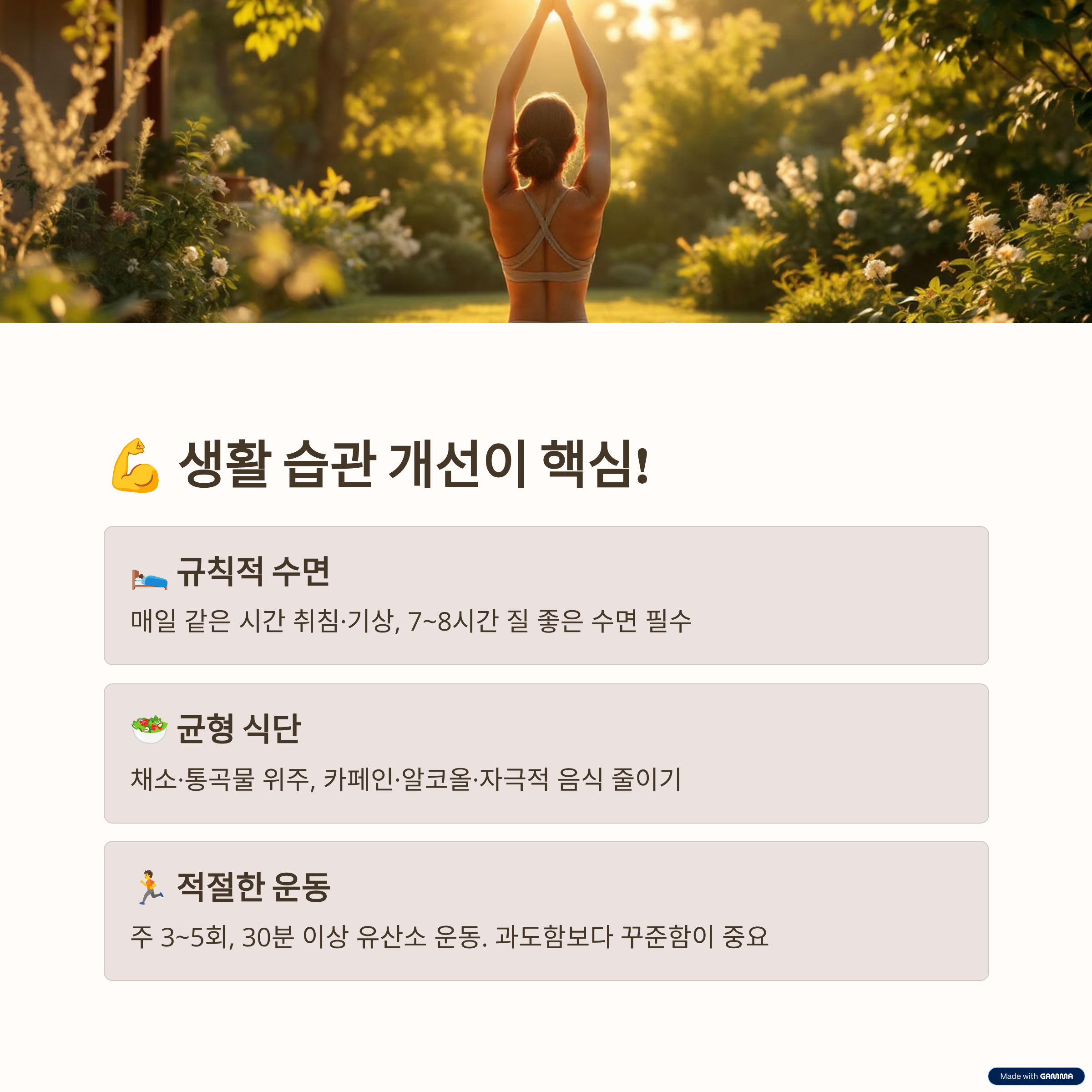 - 스트레스 관리: 명상, 요가, 취미 활동 등 자신만의 스트레스 해소법을 찾고 실천하세요. 필요한 경우 심리 상담도 좋은 방법입니다.