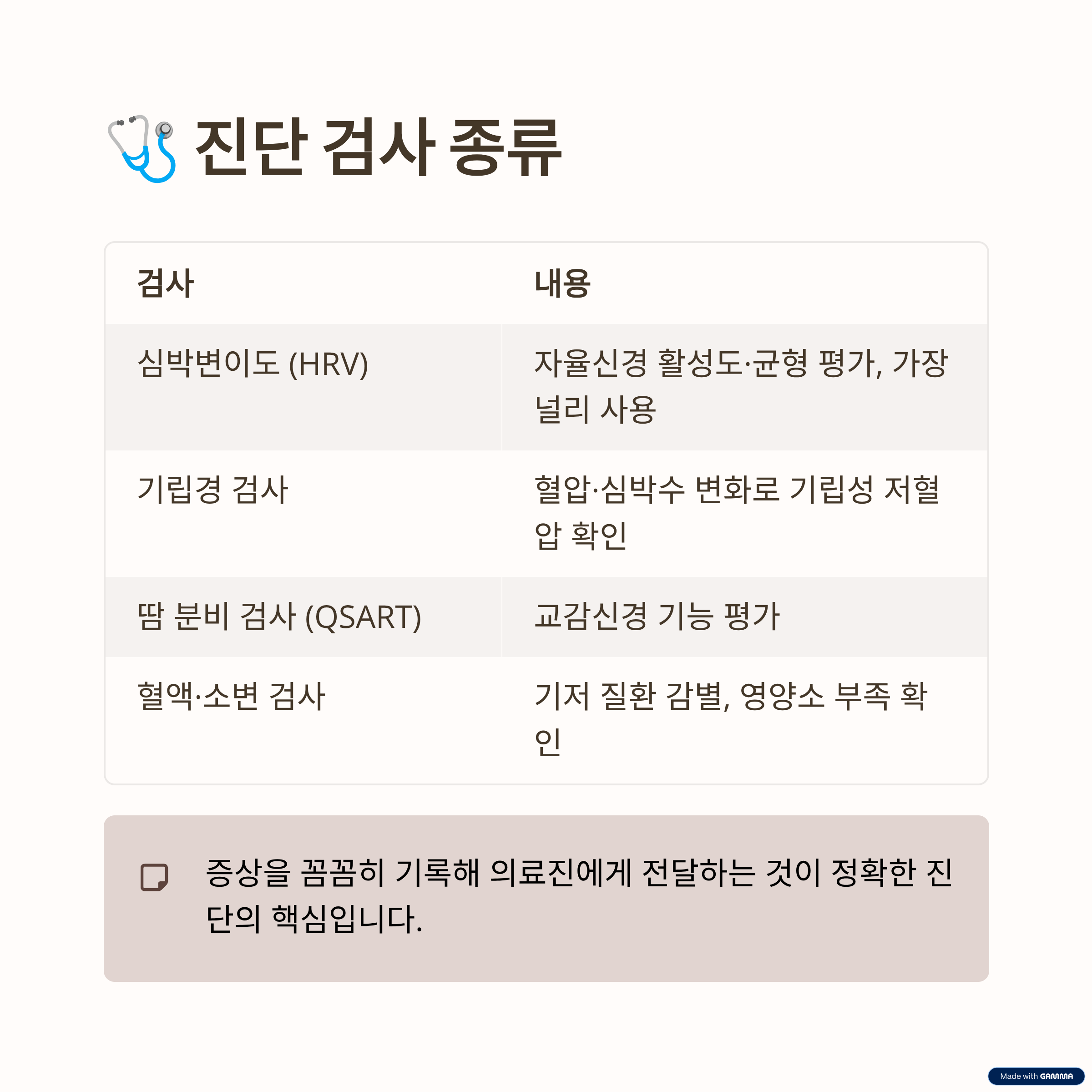 - 특정 질환: 당뇨병, 갑상선 질환, 빈혈, 류마티스 질환 등 일부 기저 질환이 자율신경계에 영향을 미칠 수 있습니다.