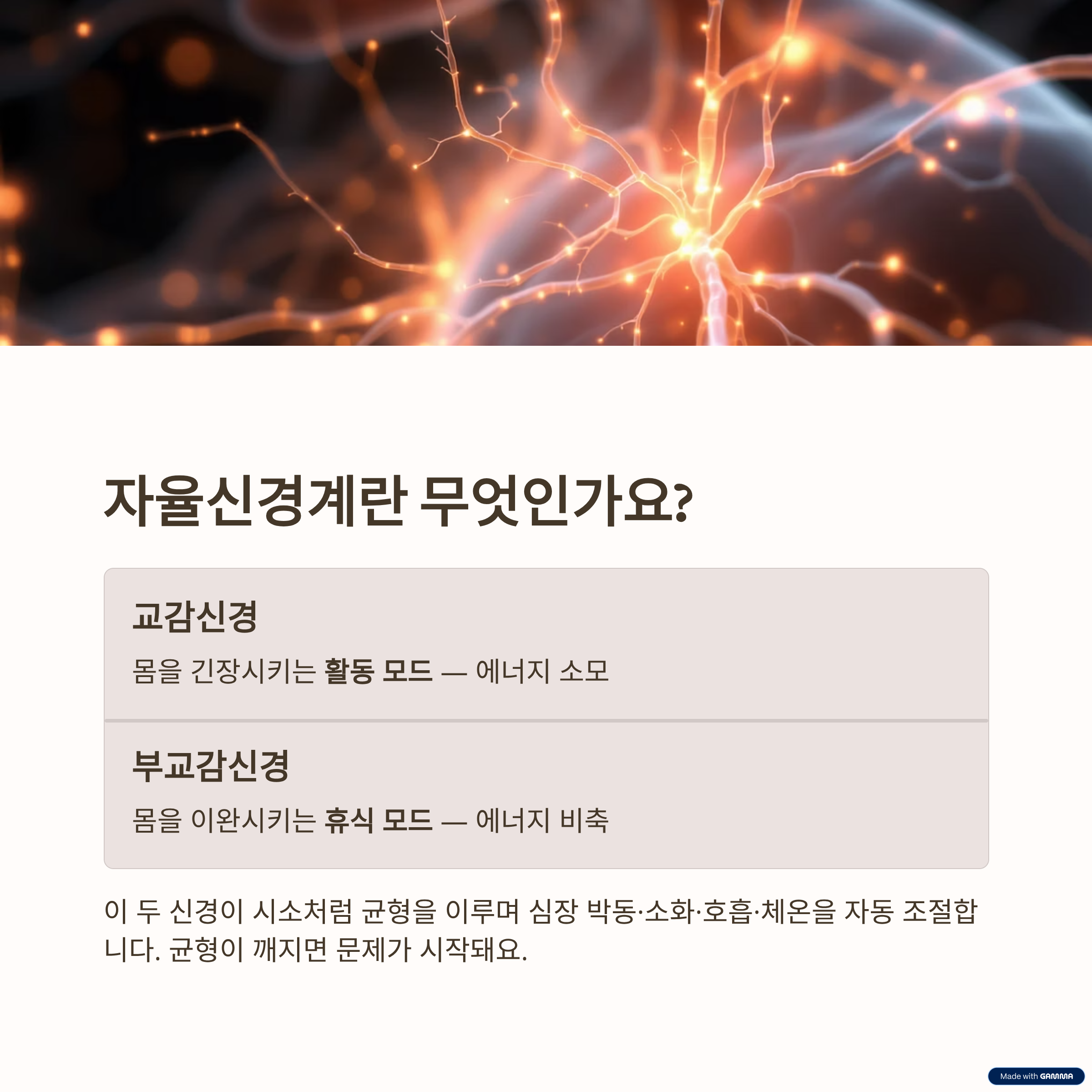 - 자율신경실조증은 교감/부교감 신경의 균형이 깨져 발생하는 전신 증상이에요.