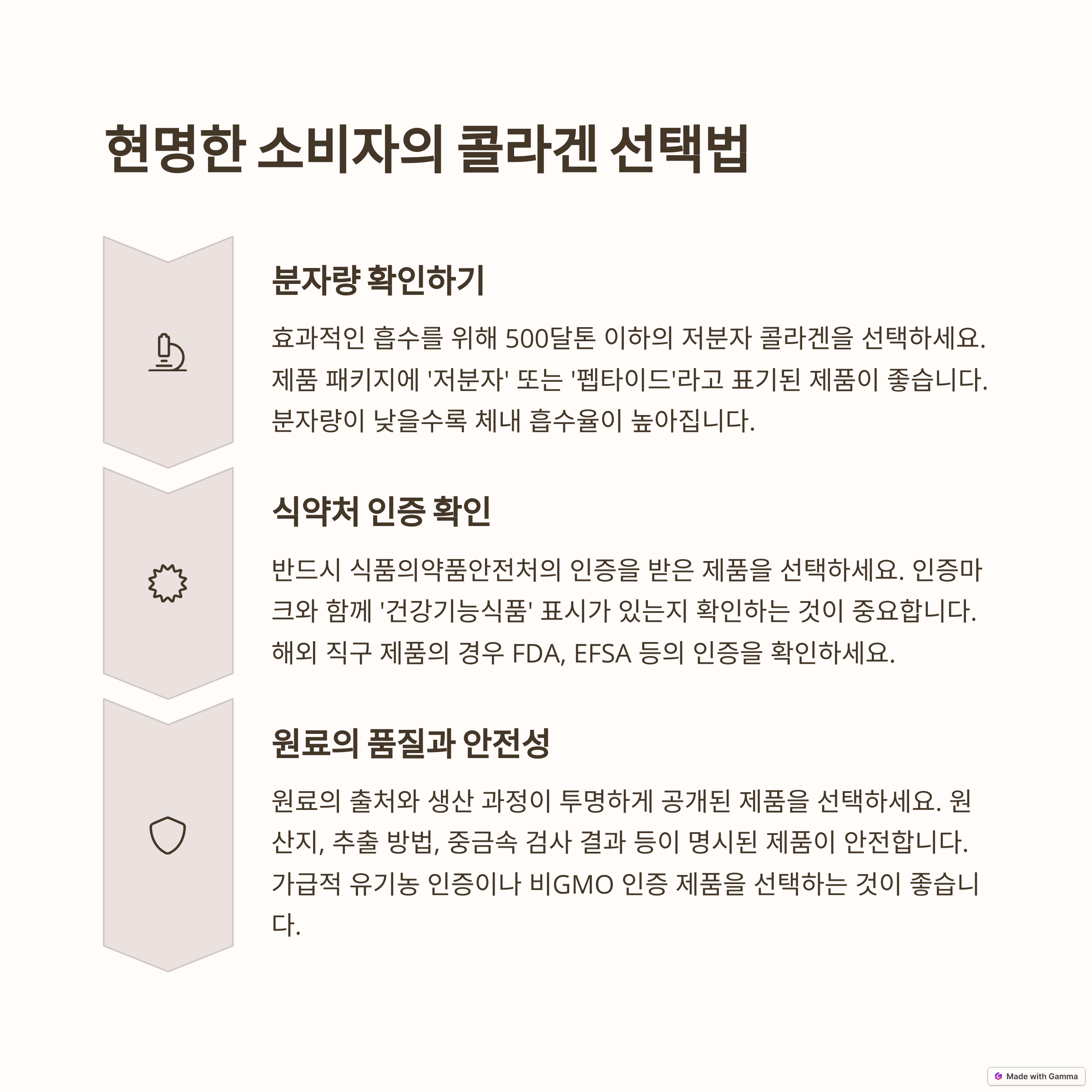 • 꾸준한 섭취: 하루에 적절한 양을 꾸준히 섭취하는 것이 중요합니다. 콜라겐은 일시적으로 섭취하는 것보다 장기적으로 섭취하는 것이 효과적입니다.