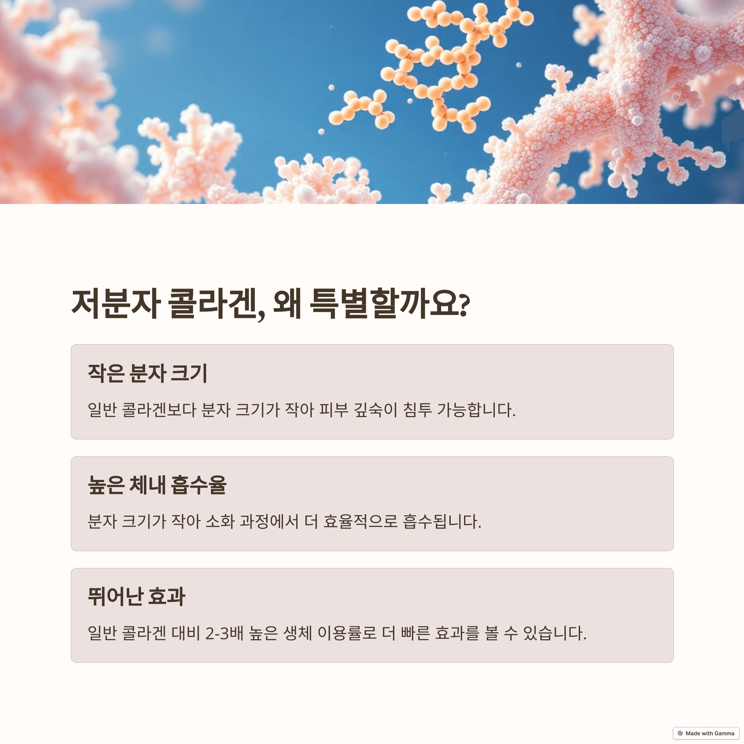 저분자 콜라겐은 일반 콜라겐보다 분자 크기가 작은 콜라겐을 의미합니다. 콜라겐 분자는 보통 다당류로 이루어진 대형 분자 화합물로, 저분자 콜라겐은 이러한 분자를 여러 단계로 분해하여 크기를 줄인 형태입니다. 분자 크기가 작을수록 체내 흡수율이 높아지기 때문에 건강 및 미용 효과가 더 뛰어나다고 알려져 있습니다.