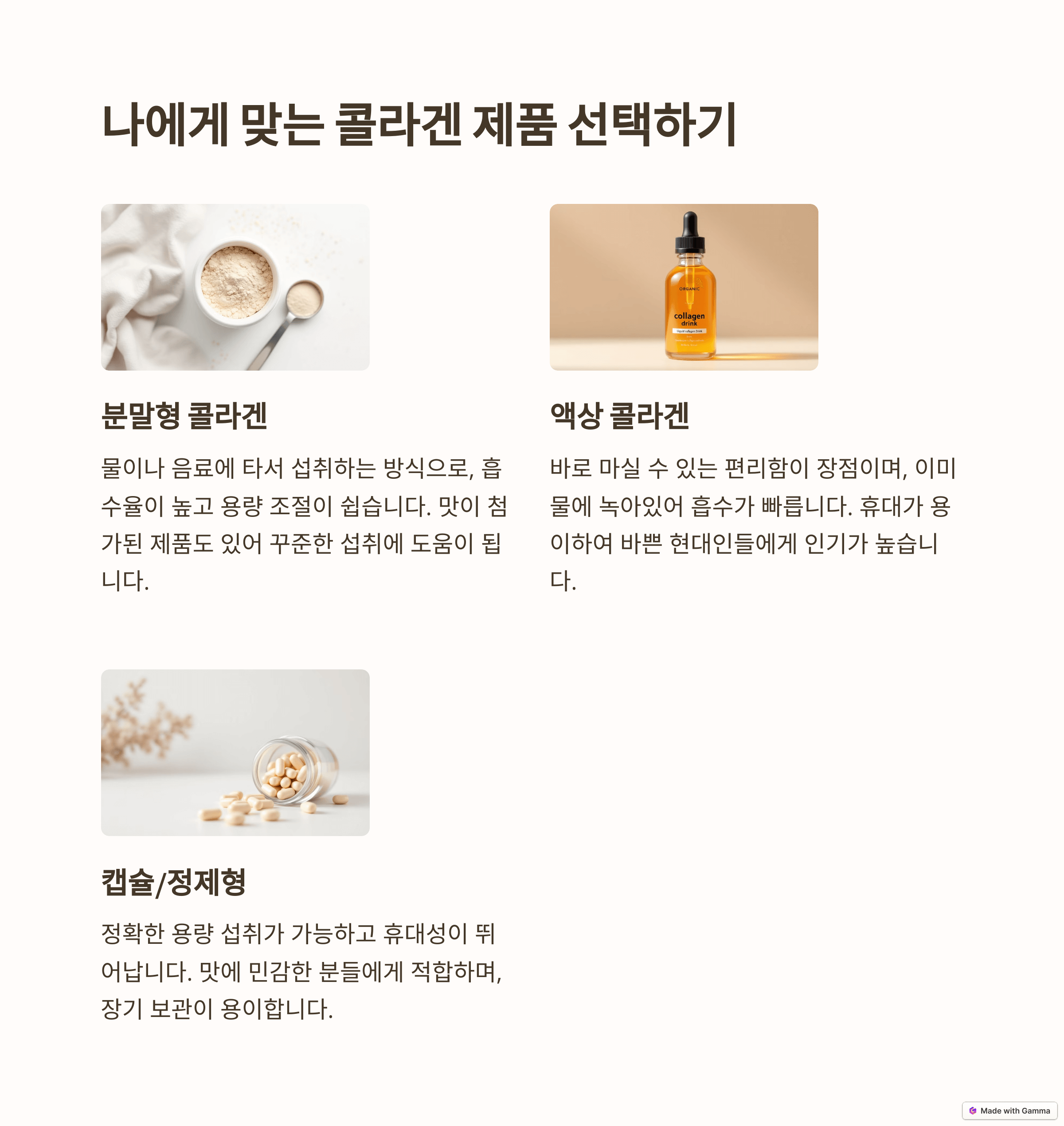 • 콜라겐 캡슐: 일정한 양을 섭취하기 쉽습니다. 알약 형태로 제공되며, 일정한 양을 보장받을 수 있어 편리합니다.