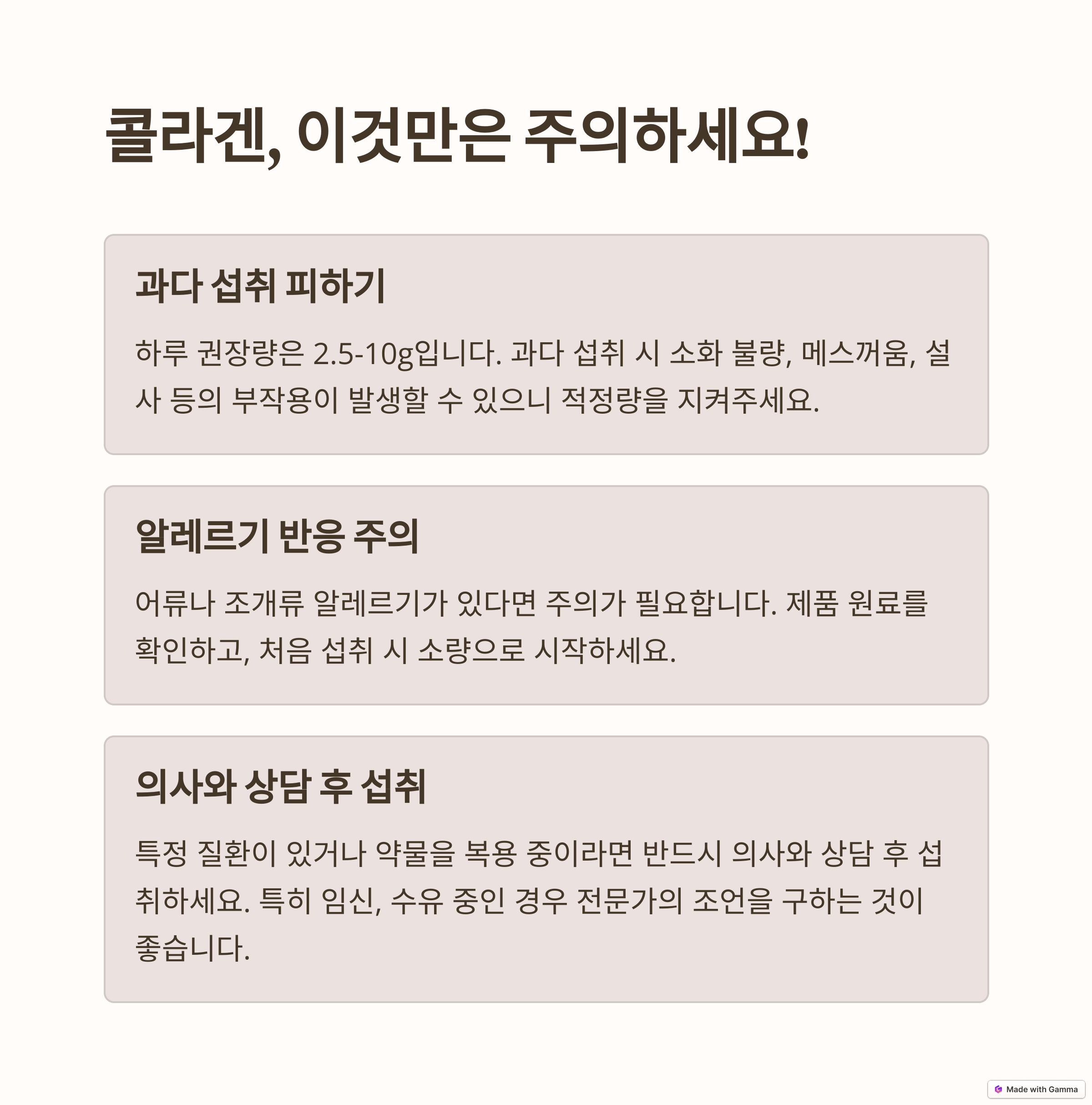 • 과다 섭취 주의: 하루 권장 섭취량을 초과하지 않도록 합니다. 과다 섭취 시 위장 장애나 소화 불량 등의 문제가 발생할 수 있습니다.