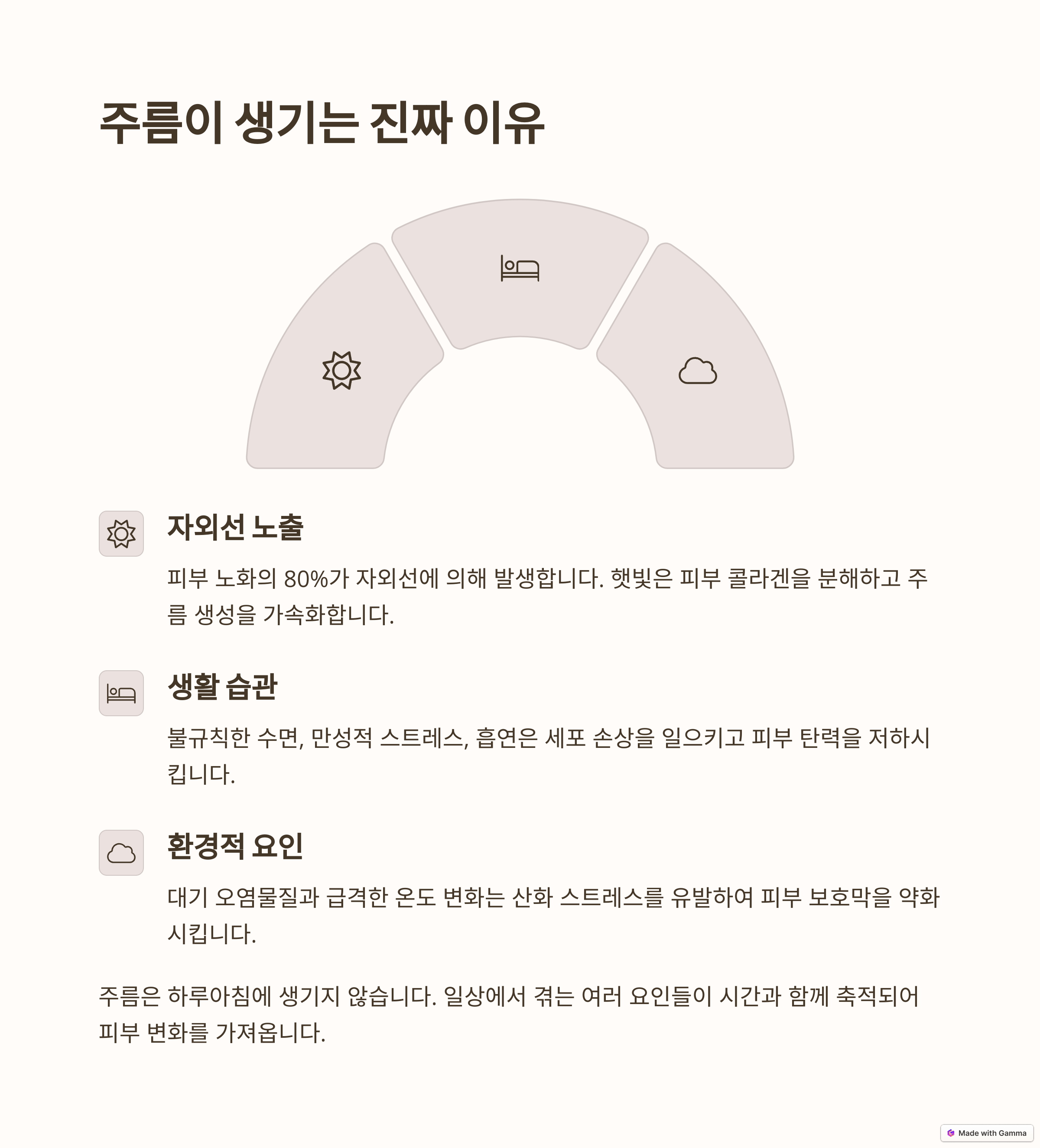 주름은 흔히 피부 노화의 결과로 생각되지만, 실제로는 다양한 요인이 복합적으로 작용하여 발생합니다. 주름의 원인을 정확히 파악하는 것은 효과적인 주름 개선 전략을 수립하는 데 매우 중요합니다.