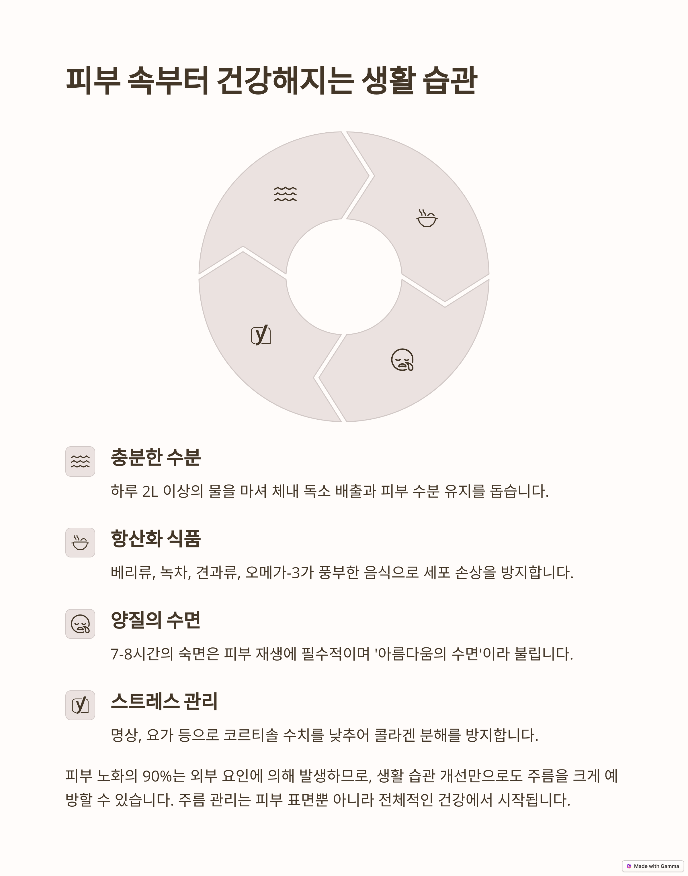 • 충분한 수면: 하루 7~8시간의 충분한 수면을 취하여 피부 재생을 돕습니다. 수면 부족은 피부 노화를 촉진하므로, 규칙적인 수면 습관을 유지하는 것이 중요합니다.