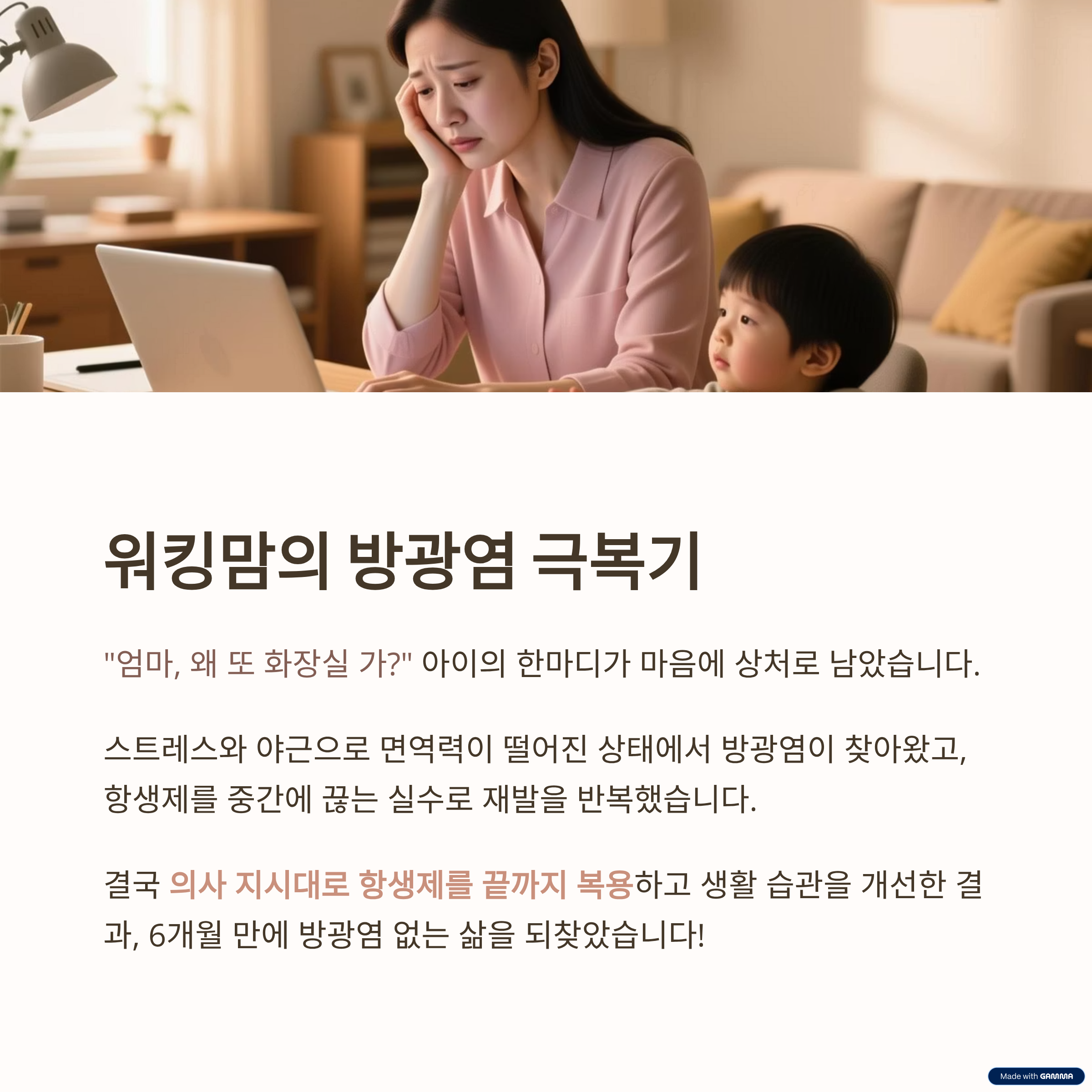 • 저는 스트레스와 잦은 야근으로 면역력이 떨어지면서 방광염을 겪었고, 초기 대처 미흡으로 재발의 악순환을 경험했습니다.