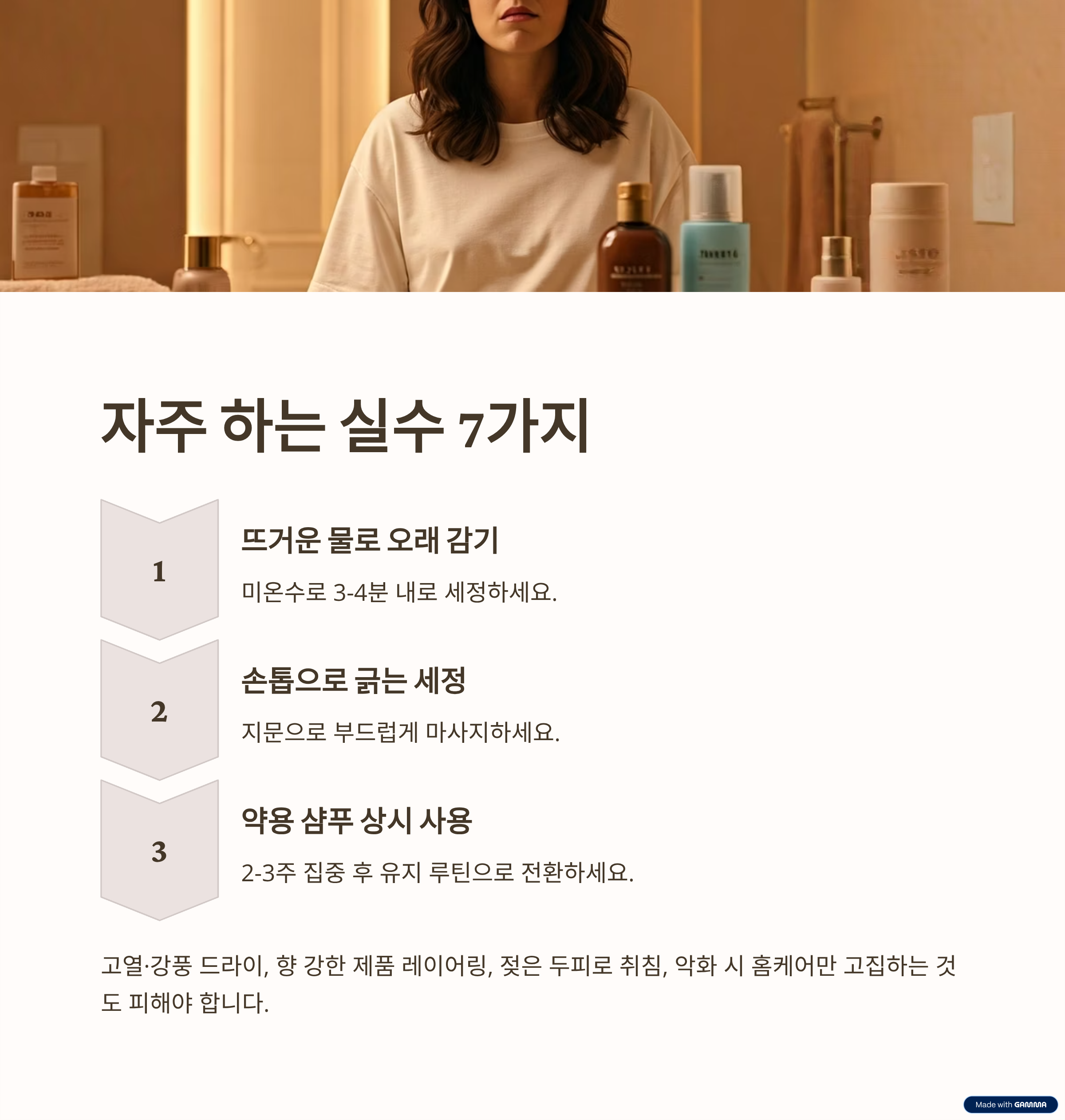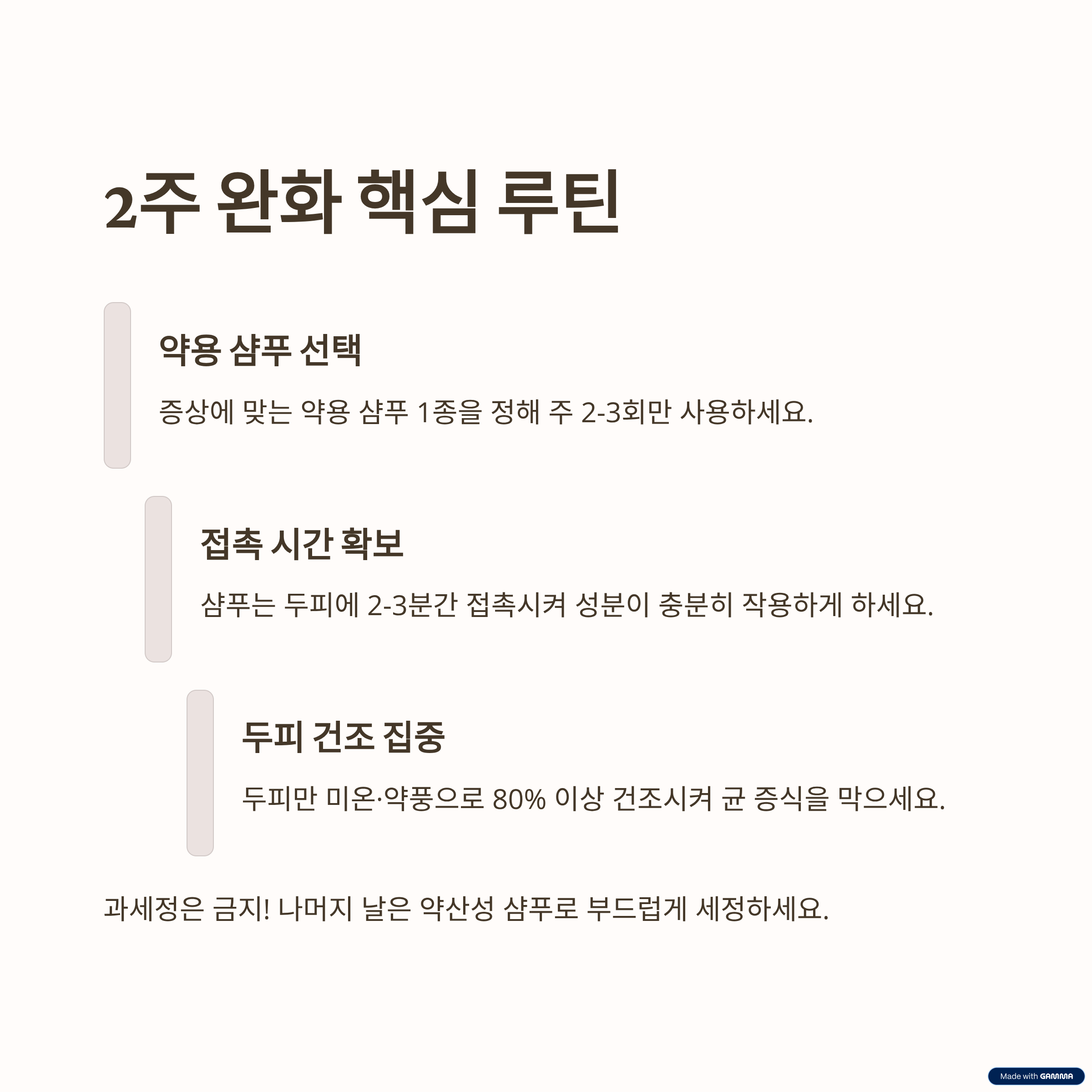 - 2주 집중 루틴: 약용 샴푸 1종, 과세정 금지, 두피만 확실히 건조
