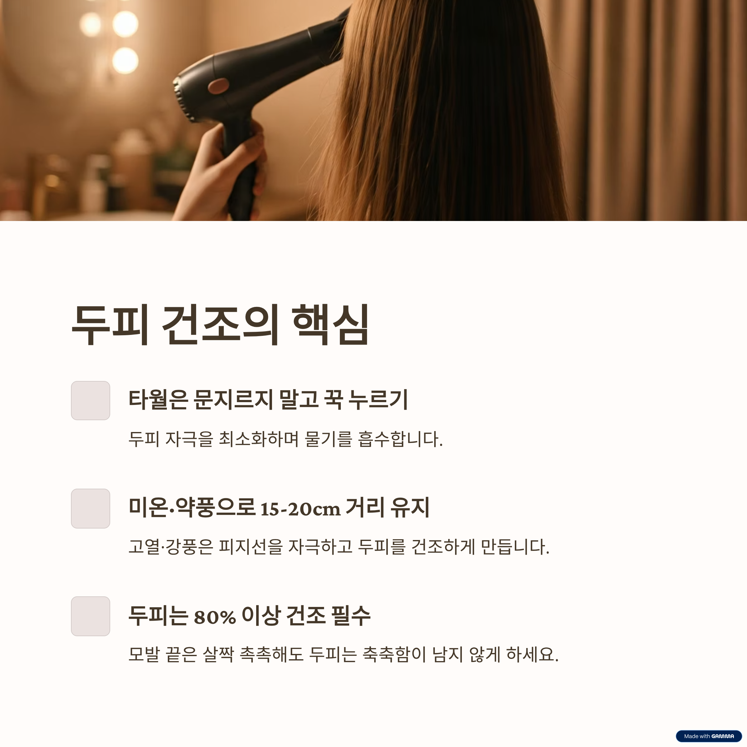 - 모발 끝은 살짝 촉촉해도 두피는 축축함이 남지 않게
