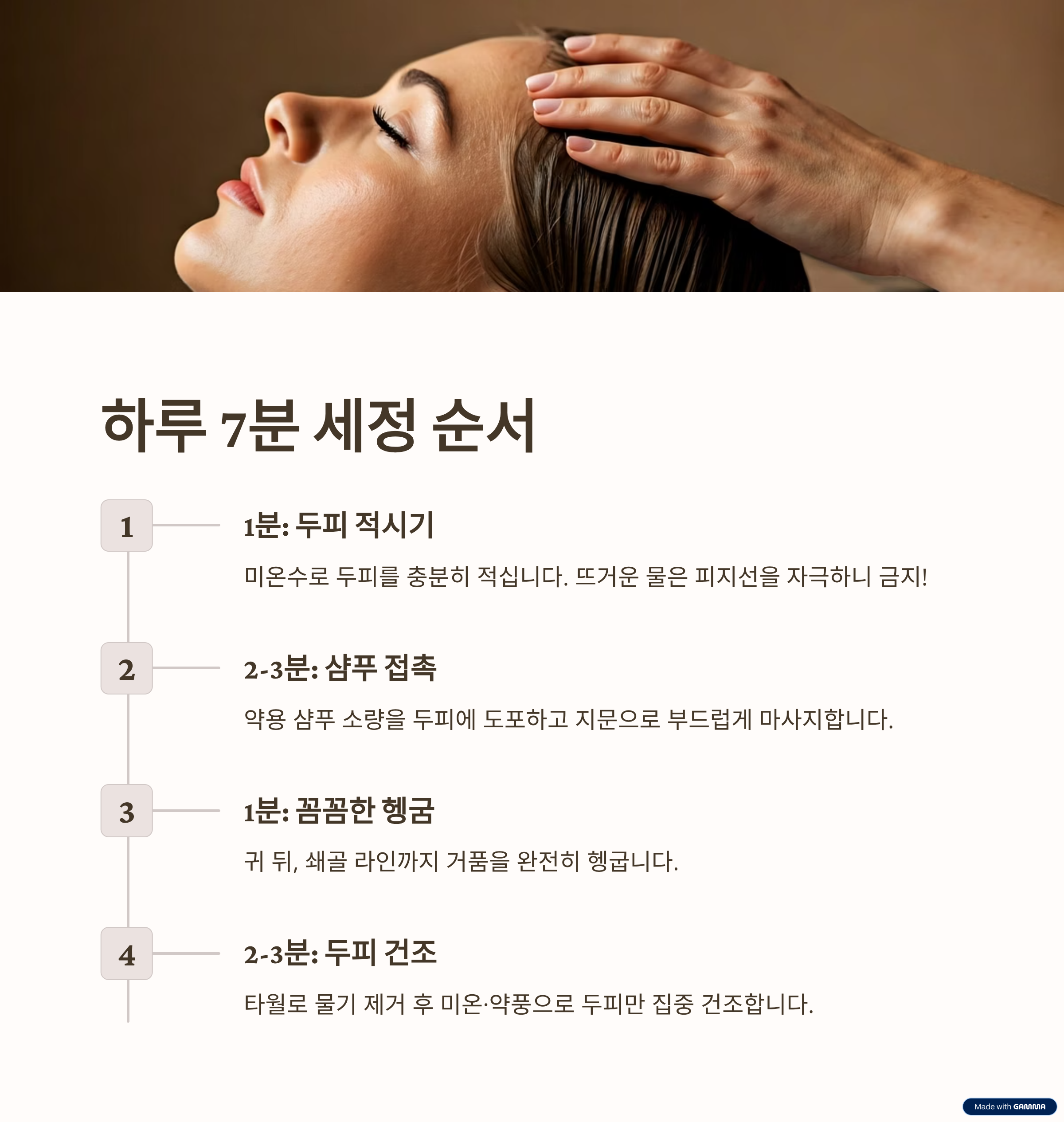 제가 해보니, 약용 샴푸 1종을 정해 주 2~3회만 2~3분 접촉하고, 나머지는 약산성 샴푸로 짧고 부드럽게 세정하는 게 핵심이었습니다. 샤워 후에는 두피만 미온·약풍으로 80% 이상 건조. 여기에 수면 7시간과 당분·야식 컷을 더하니 2주 차부터 가려움·각질이 뚜렷하게 줄었어요.