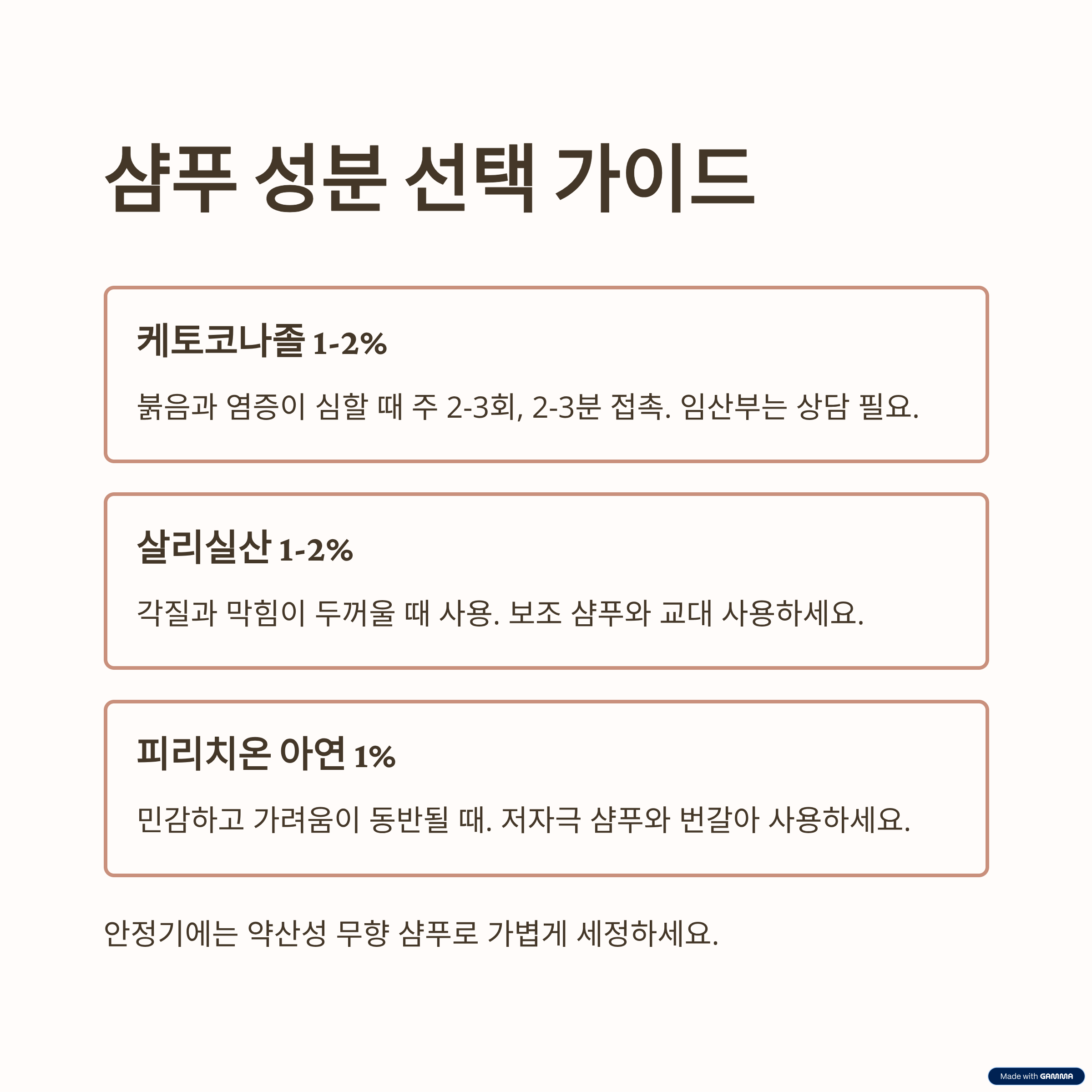 한줄 요약: 염증엔 케토코나졸, 각질엔 살리실산, 민감 균형엔 피리치온 아연, 안정기엔 약산성.