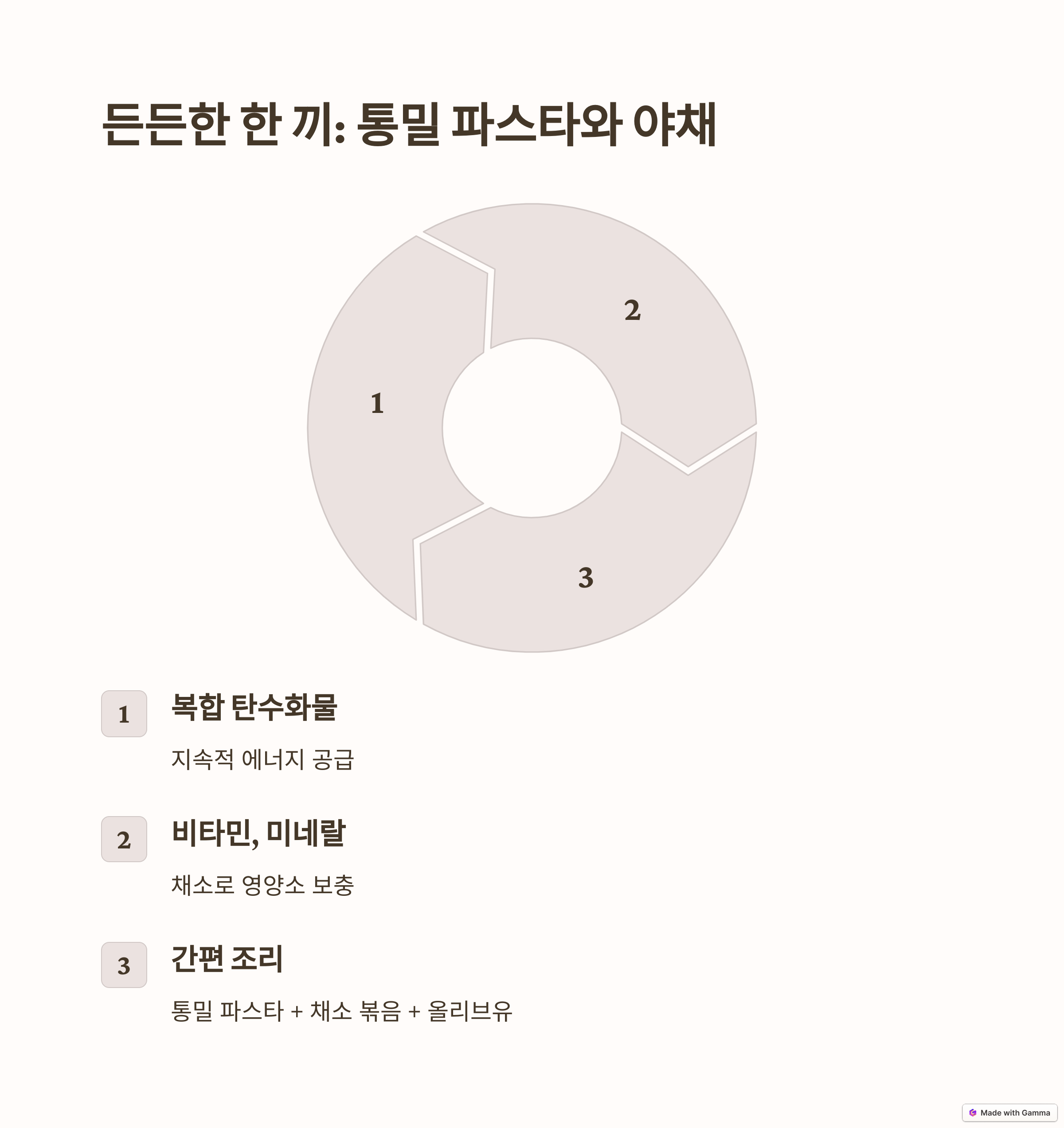 통밀 파스타는 정제된 밀보다 식이섬유와 영양소가 더욱 풍부하여 혈당 관리에 도움이 됩니다. 또한, 포만감을 오래 유지해 체중 관리에 유리합니다.