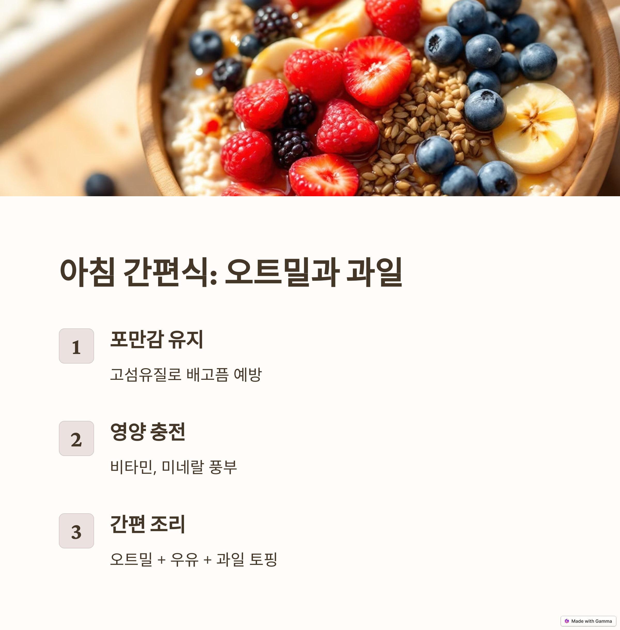 오트밀은 식이섬유가 풍부해 포만감을 오래 유지시켜주며, 체중 관리에 도움을 줍니다. 또한, 항산화 물질을 포함하고 있어 건강한 아침 식사로 매우 적합합니다.