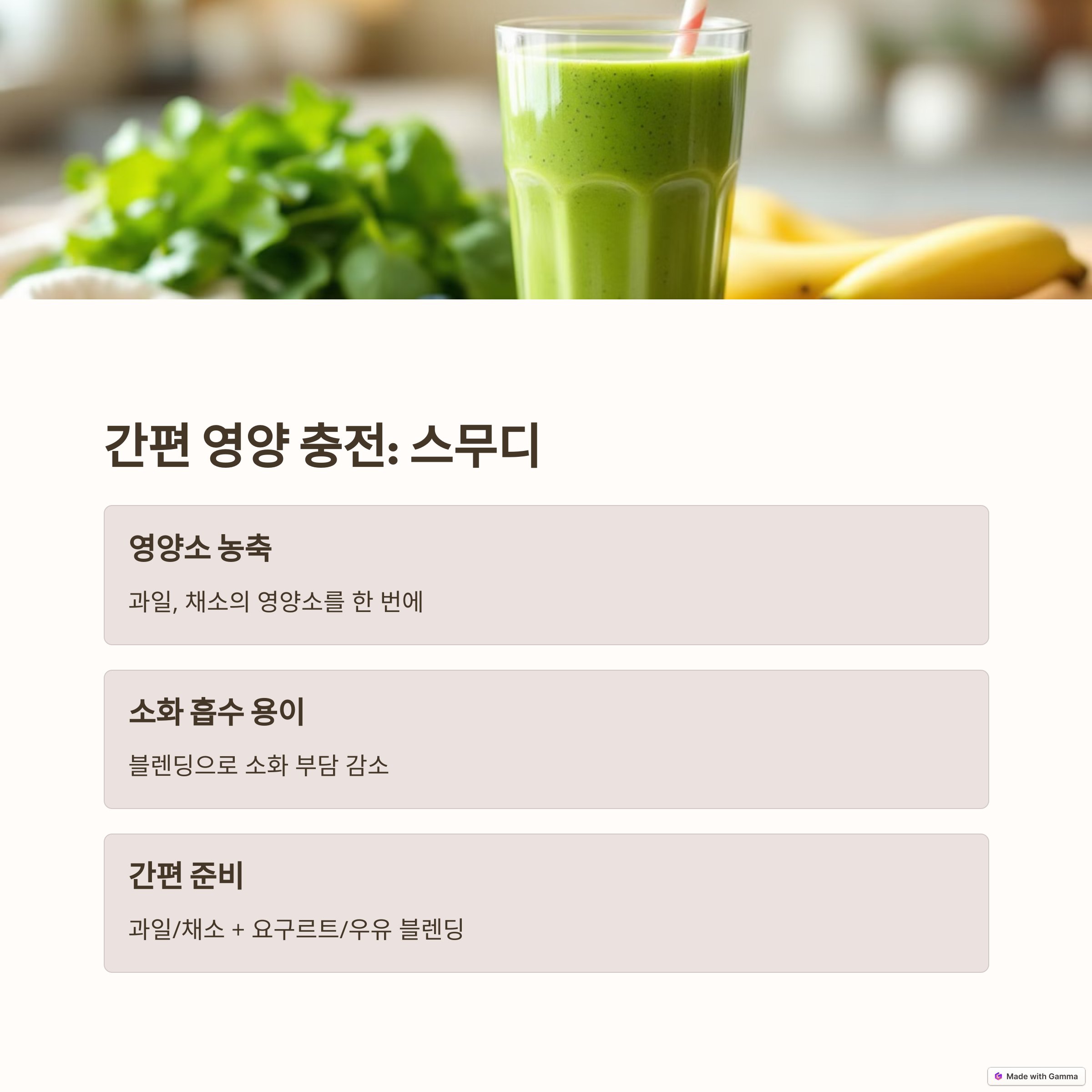 스무디는 과일과 채소를 쉽게 섭취할 수 있는 방법으로, 다양한 비타민과 항산화 물질을 자연스럽게 섭취할 수 있습니다.