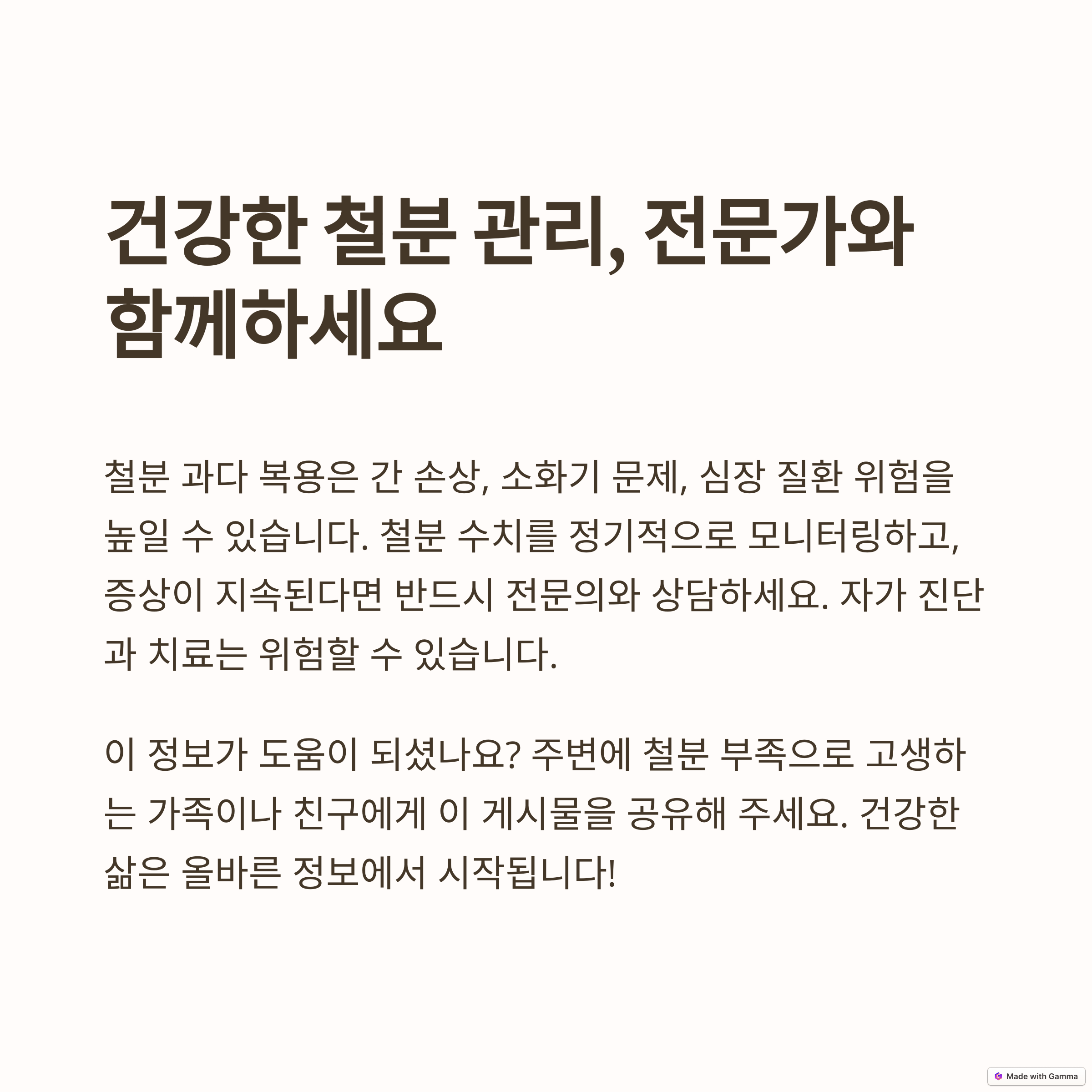 철분 부족은 방치하면 심각한 건강 문제로 이어질 수 있지만, 적극적으로 대처하면 충분히 극복할 수 있습니다. 오늘 알려드린 정보를 바탕으로 철분 부족을 예방하고, 건강하고 활기찬 삶을 되찾으세요! 오늘부터 철분 풍부한 식단을 시작하고, 가까운 병원을 방문하여 상담받아보세요!