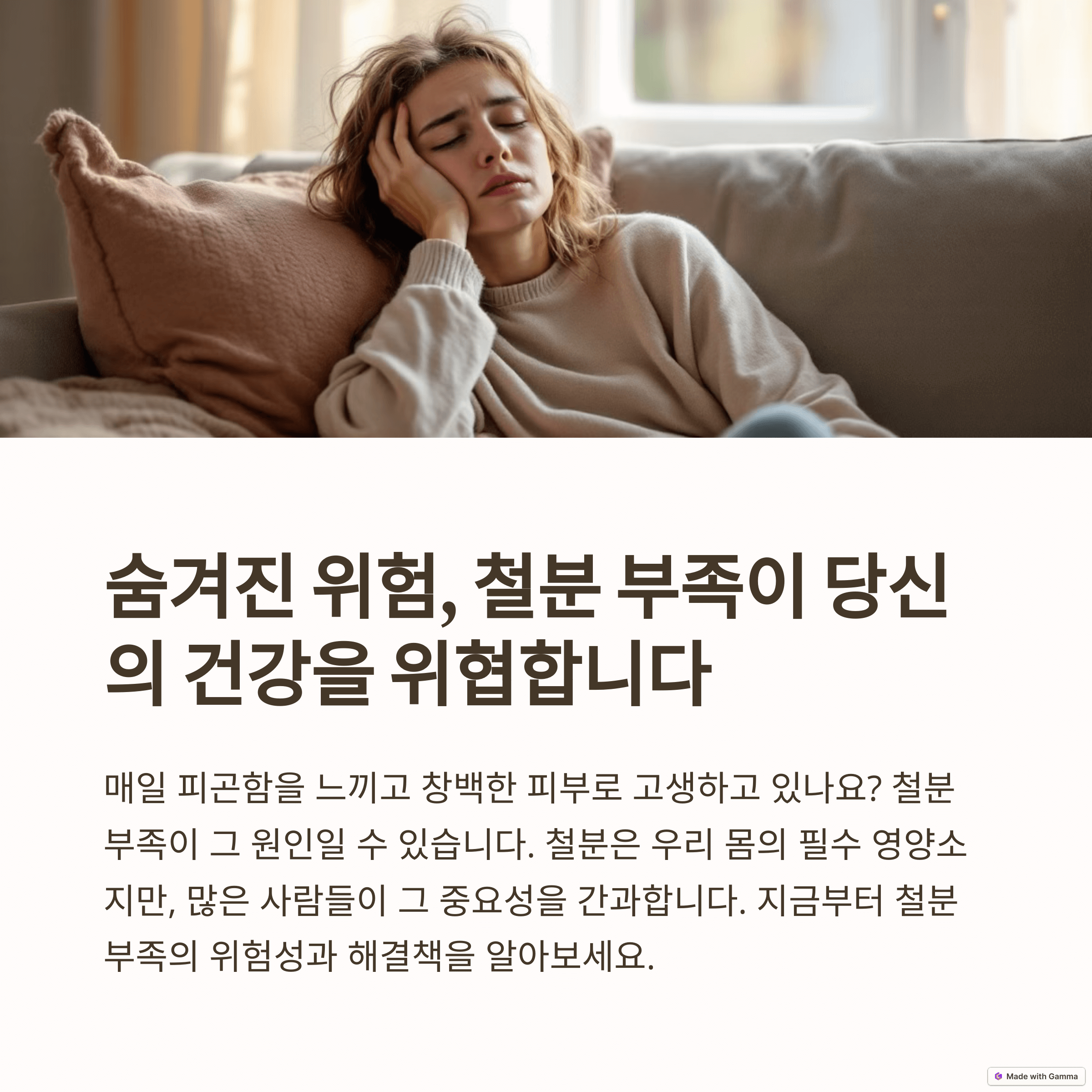 아침에 일어나기 힘들고, 잦은 야근에 지쳐 늘 피곤하신가요? 거울을 볼 때마다 피부가 점점 창백해지는 것 같나요? 계단을 오르거나 조금만 움직여도 숨이 턱턱 막히시나요? 이러한 증상들이 반복된다면, 우리 몸이 철분 부족으로 "SOS" 신호를 보내고 있는 것일지도 모릅니다. 철분은 생명 유지에 필수적인 영양소이지만, 많은 사람들이 철분 결핍을 겪고 있으며, 이를 방치할 경우 심각한 건강 문제 (예: 빈혈)로 이어질 수 있습니다. 지금부터 철분 부족의 심각성을 깨닫고, 10가지 주요 증상과 완벽한 해결법을 통해 건강을 되찾아보는 시간을 가져보겠습니다.