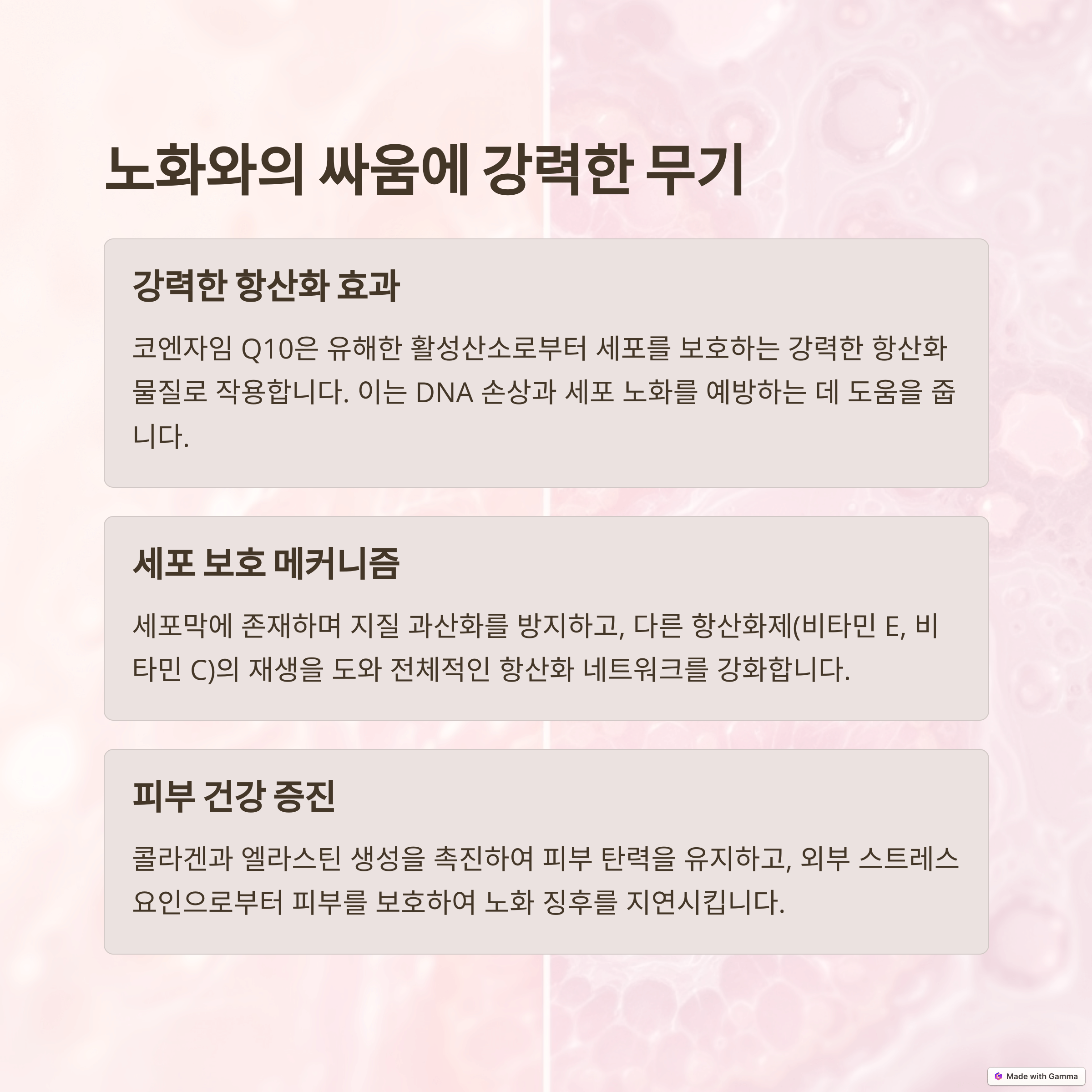 CoQ10은 또한 강력한 항산화 작용을 통해 세포를 손상시키는 활성산소로부터 보호합니다. 활성산소는 세포의 DNA, 단백질, 지질 등을 손상시켜 노화와 다양한 질병을 유발하는 주요 원인 중 하나입니다. CoQ10은 이러한 활성산소를 제거하여 세포를 보호하고, 건강을 유지하는 데 기여합니다.