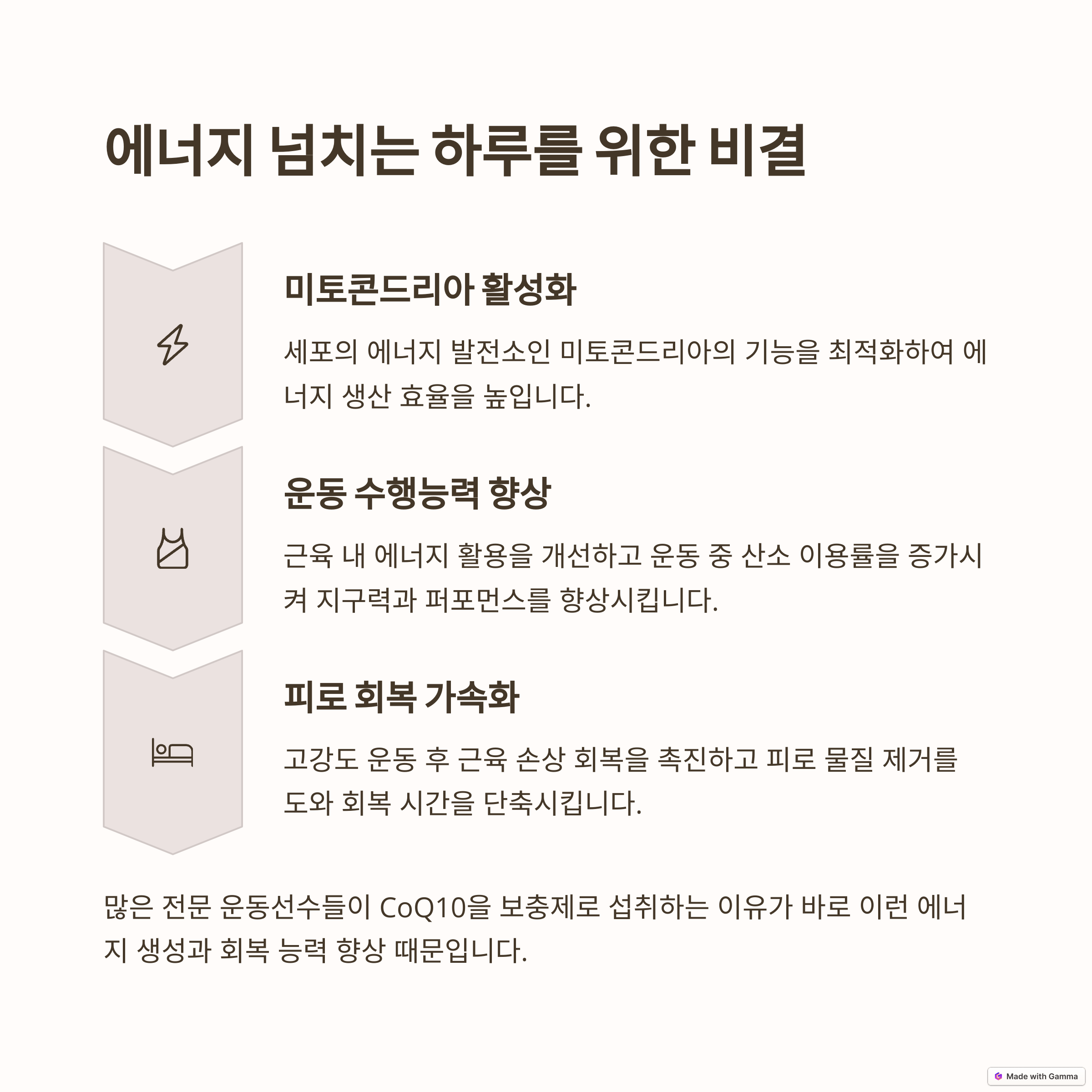 • 운동 능력 향상: CoQ10은 근육 세포의 에너지 생산을 돕고, 근육 손상을 억제하여 운동 능력 향상에 도움을 줄 수 있습니다. 또한, CoQ10은 운동 후 피로 회복을 촉진하고, 근육 통증을 완화하는 데 기여할 수 있습니다. Journal of the International Society of Sports Nutrition 학술지에 게재된 연구에 따르면, CoQ10은 운동 선수들의 근력과 지구력을 향상시키고, 운동 후 근육 손상을 줄이는 데 도움이 될 수 있습니다.
