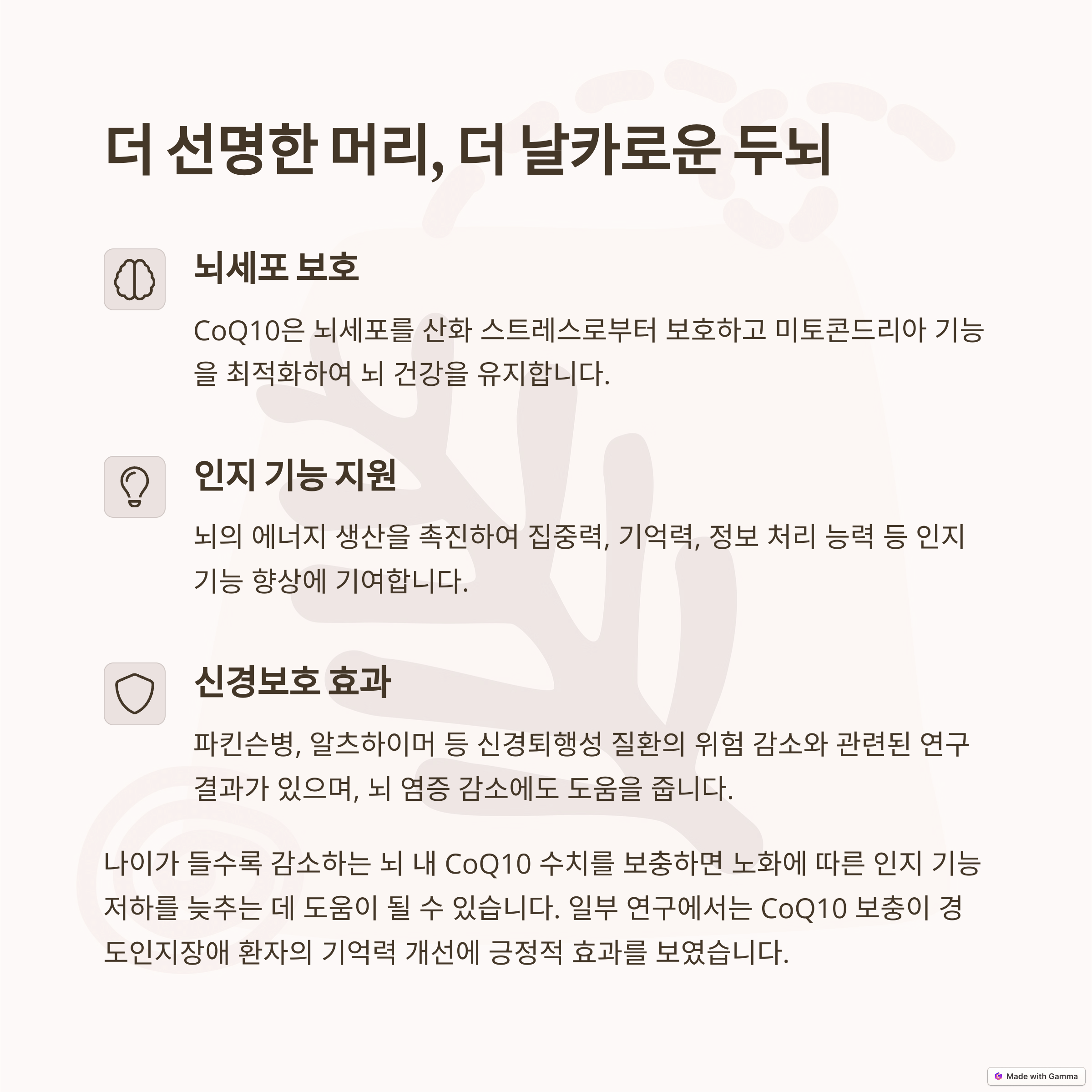 - 뇌 기능 개선: CoQ10은 뇌세포의 에너지 생산을 돕고, 뇌세포를 보호하여 뇌 기능 개선에 도움을 줄 수 있습니다. 또한, CoQ10은 뇌 혈류를 개선하고, 신경세포 손상을 억제하여 알츠하이머병, 파킨슨병 등 신경퇴행성 질환 예방에 기여할 수 있습니다. Journal of Neurochemistry 학술지에 발표된 연구에서는 CoQ10이 뇌세포의 미토콘드리아 기능을 개선하고, 신경세포 손상을 줄이는 효과가 있는 것으로 나타났습니다.