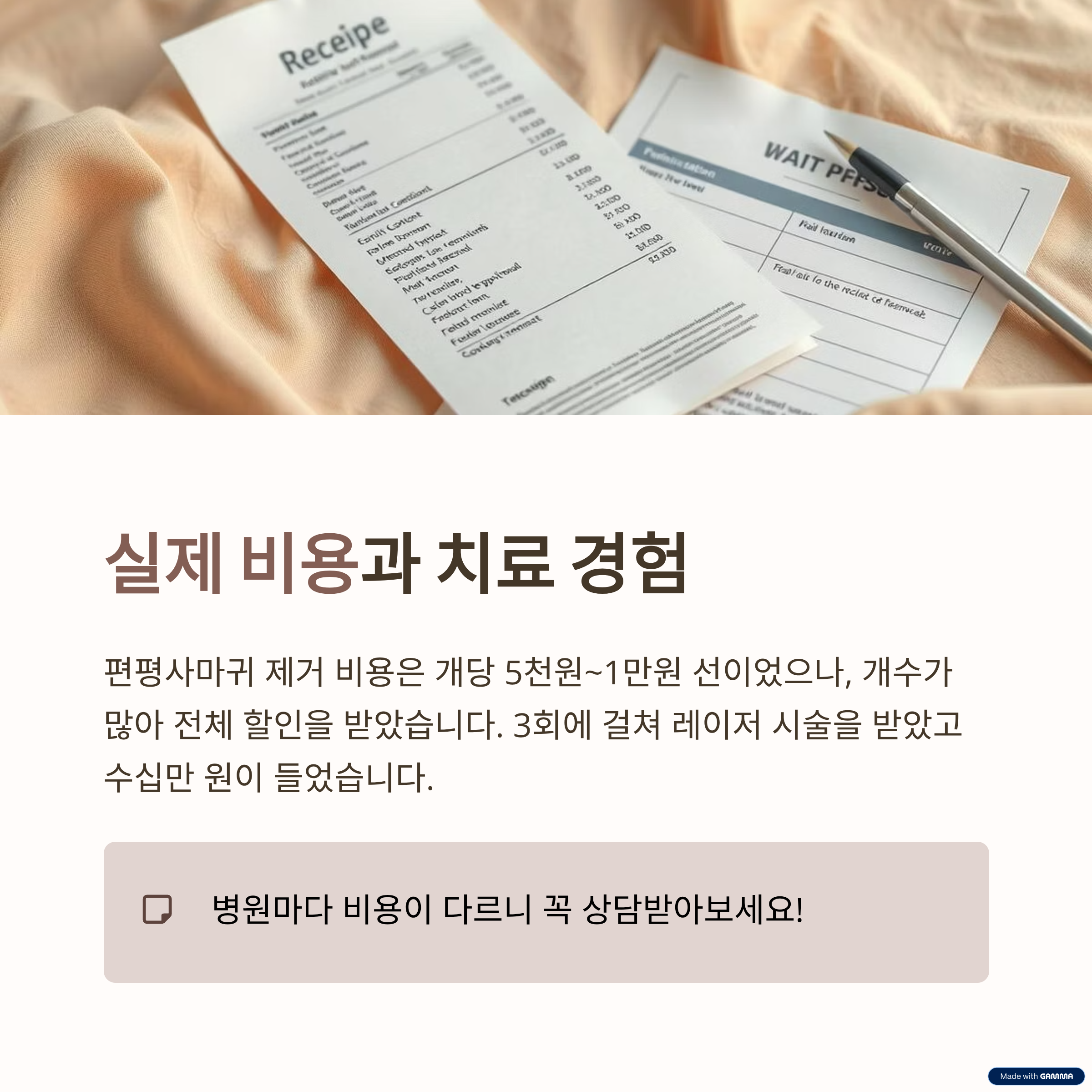시행착오 → 해결 → 결과: 처음엔 좁쌀여드름인 줄 알고 손으로 짜내려 했던 게 최악의 실수였습니다. 자극받은 사마귀는 보란 듯이 주변으로 번져나갔죠. 결국 피부과를 찾았고, 수십만 원의 편평사마귀 제거 비용을 들여 3회에 걸쳐 레이저 시술을 받았습니다. (비용은 개당 5천원~1만원 선이었지만, 개수가 많아 전체 제거 비용 할인을 받았습니다. 병원마다 다르니 꼭 상담받아보세요.) 시술 후에는 의사 선생님의 조언대로 면역력 관리에 집중했습니다. 피곤해도 30분씩 꼭 산책하고, 몸에 좋다는 율무를 밥에도 넣어 먹고 차로도 마셨어요. 1년이 지난 지금, 재발 없이 90% 이상 깨끗해진 피부를 유지하고 있습니다. 오돌토돌함 없이 매끈한 피부를 만질 때마다 ‘정말 노력하길 잘했다’는 생각이 듭니다.