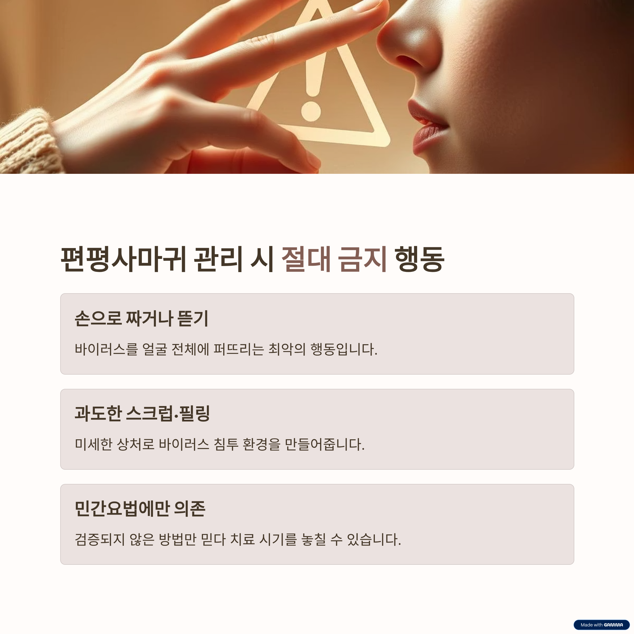 - 손으로 짜거나 뜯지 않기: 바이러스를 스스로 얼굴 전체에 퍼뜨리는 행동입니다.