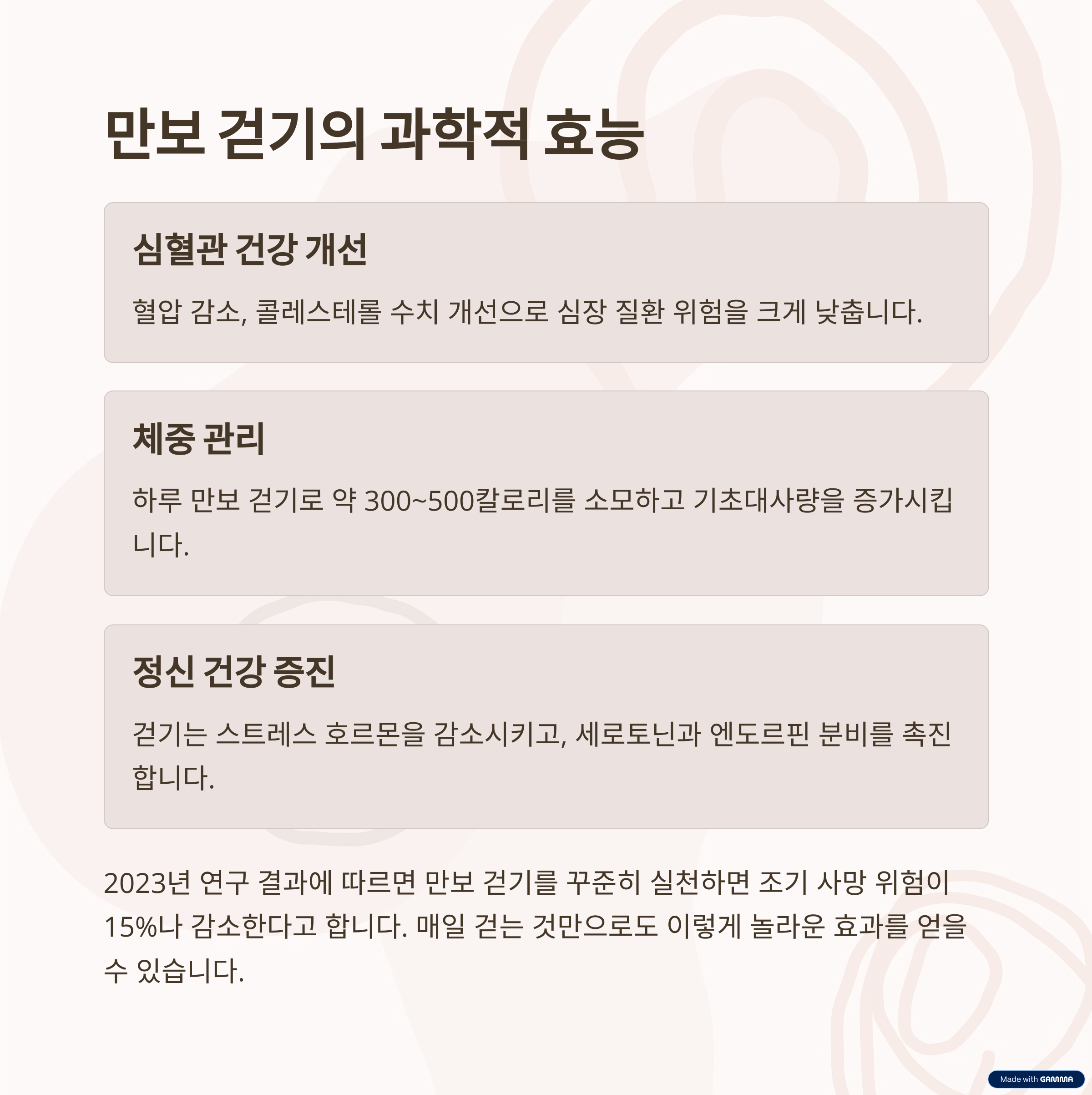 - 연구 결과: 규칙적인 걷기 운동은 우울증 증상을 완화하고, 불안감을 줄이며, 인지 기능을 향상시키는 것으로 나타났습니다.