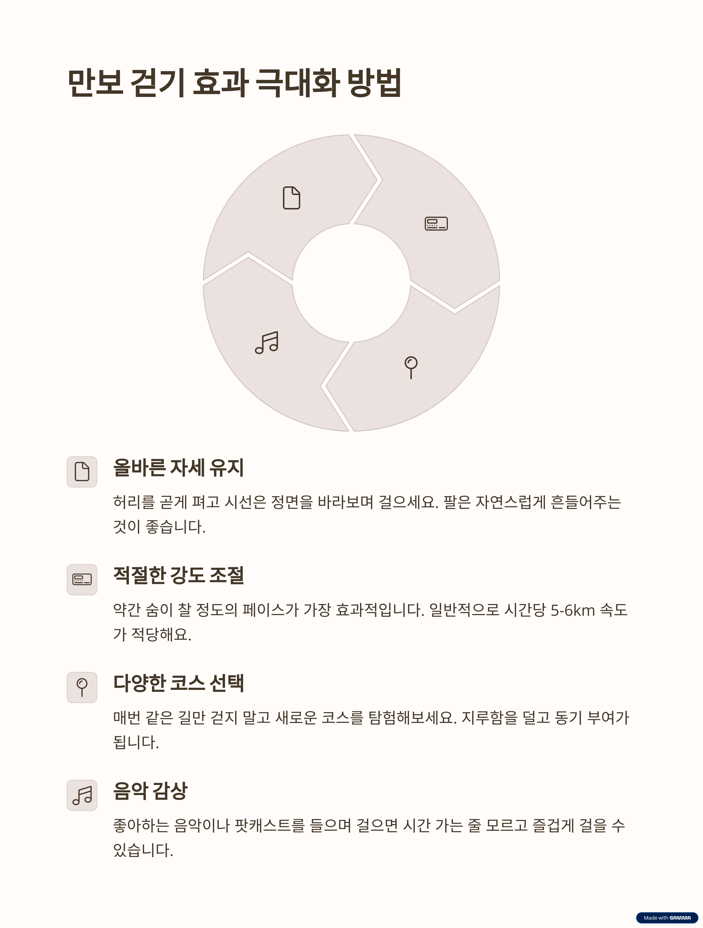 - 팁: 자연 속에서 걷거나, 좋아하는 음악을 들으면서 걸으면 정신 건강에 더욱 긍정적인 효과를 얻을 수 있습니다.