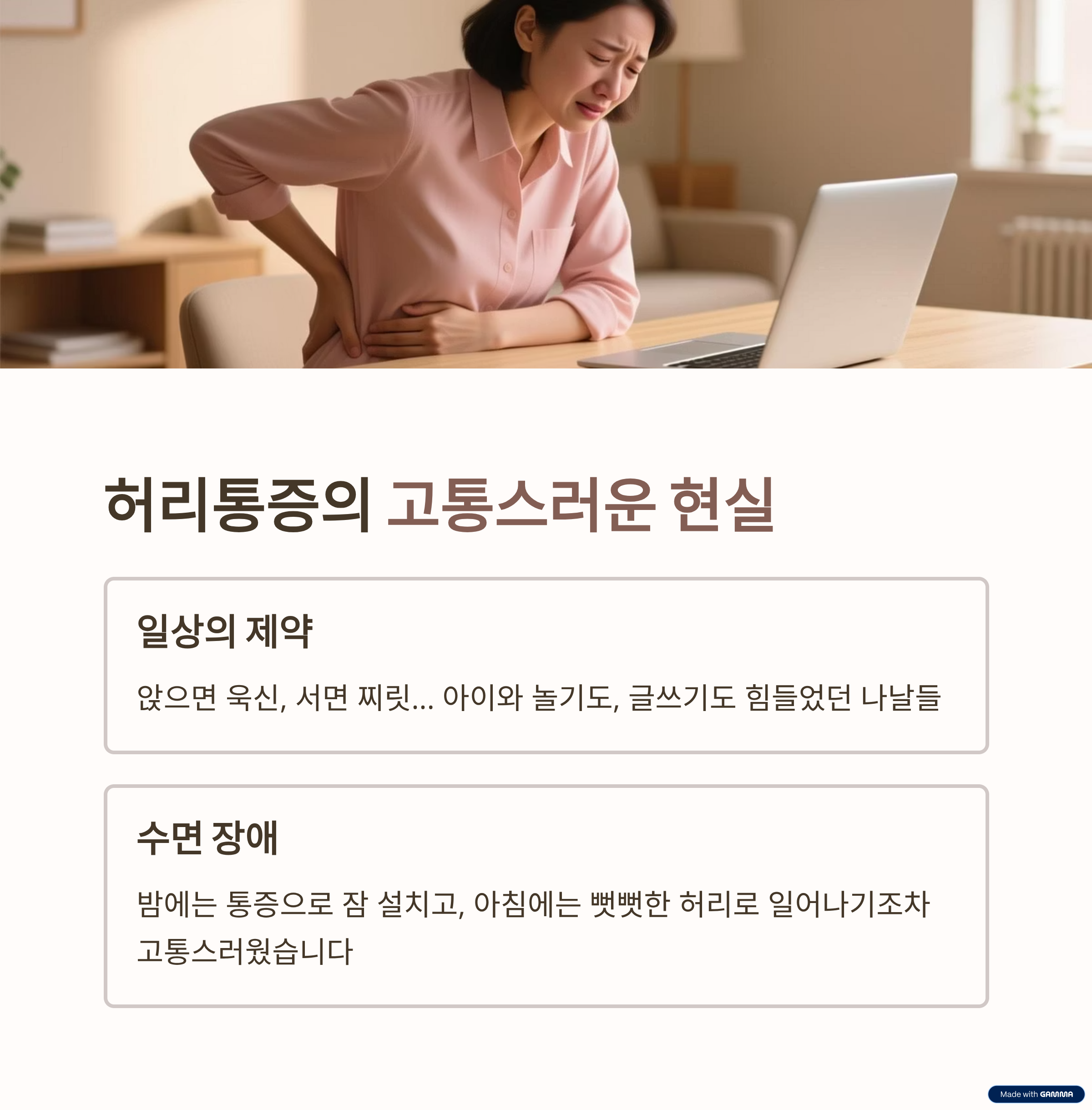 제 허리 통증이 가장 심했을 때는 아이가 뛰어놀자고 해도 선뜻 몸이 움직이지 않았습니다. 욱신거리는 허리를 부여잡고 침대에 누워 있을 때가 많았고, 아이에게 동화책을 읽어주다가도 허리가 아파 자세를 바꾸곤 했습니다. 창작자로서 블로그에 글을 쓰는 것 자체도 고역이었습니다. 장시간 앉아 글을 쓸수록 허리는 점점 더 굳어가는 것 같았고, 마감 시간은 다가오는데 통증 때문에 집중조차 할 수 없을 때는 정말 좌절스러웠습니다. 한때 대상포진이나 방광염 같은 다른 질환으로 힘들었을 때도 있었지만, 허리 통증은 매일매일 저를 따라다니는 그림자 같았습니다.