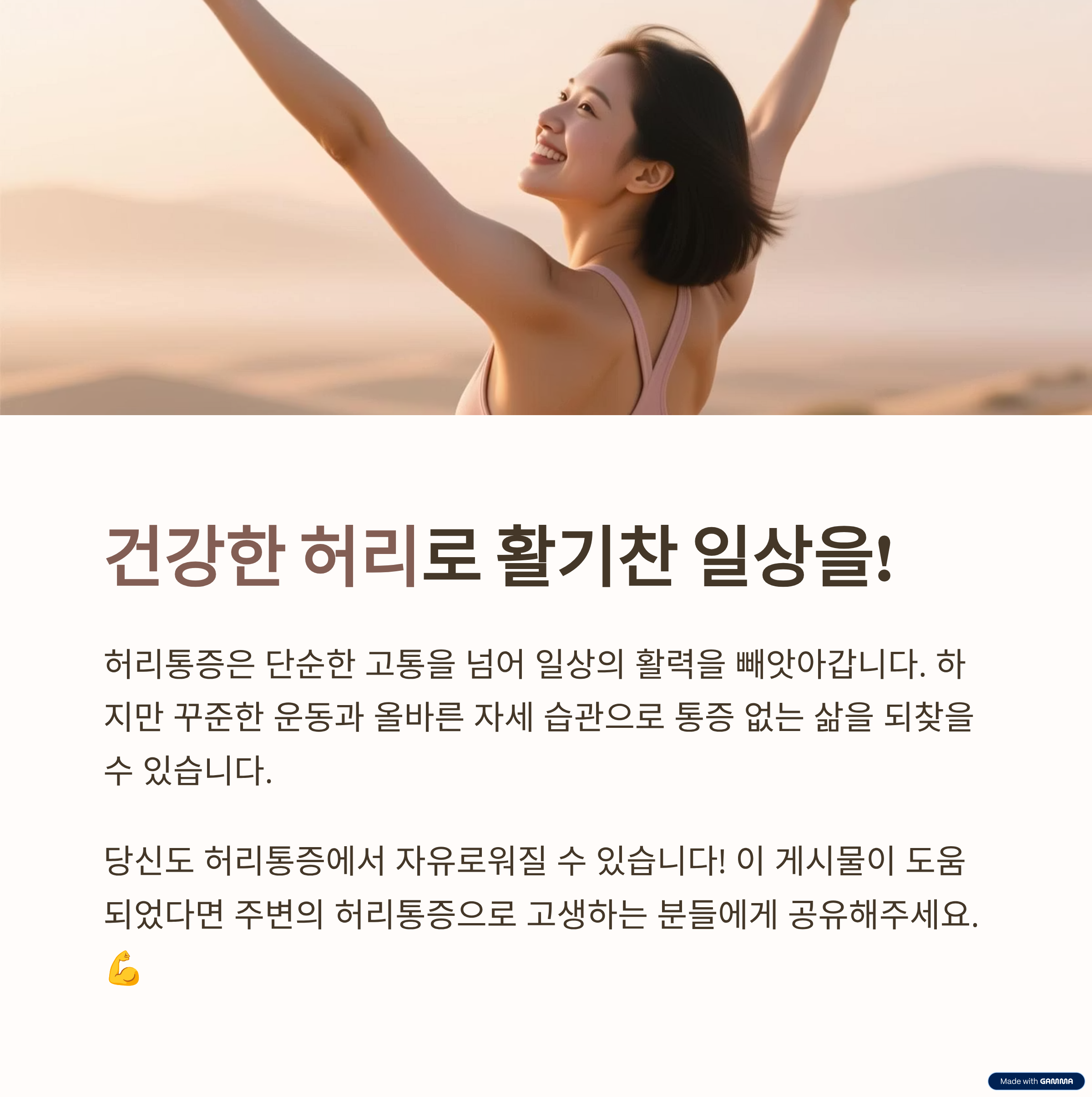 - 증상 완화를 위해서는 약물이나 물리치료도 필요하지만, 근본적인 해결을 위해서는 코어 근육 강화와 올바른 자세 습관이 핵심입니다.
