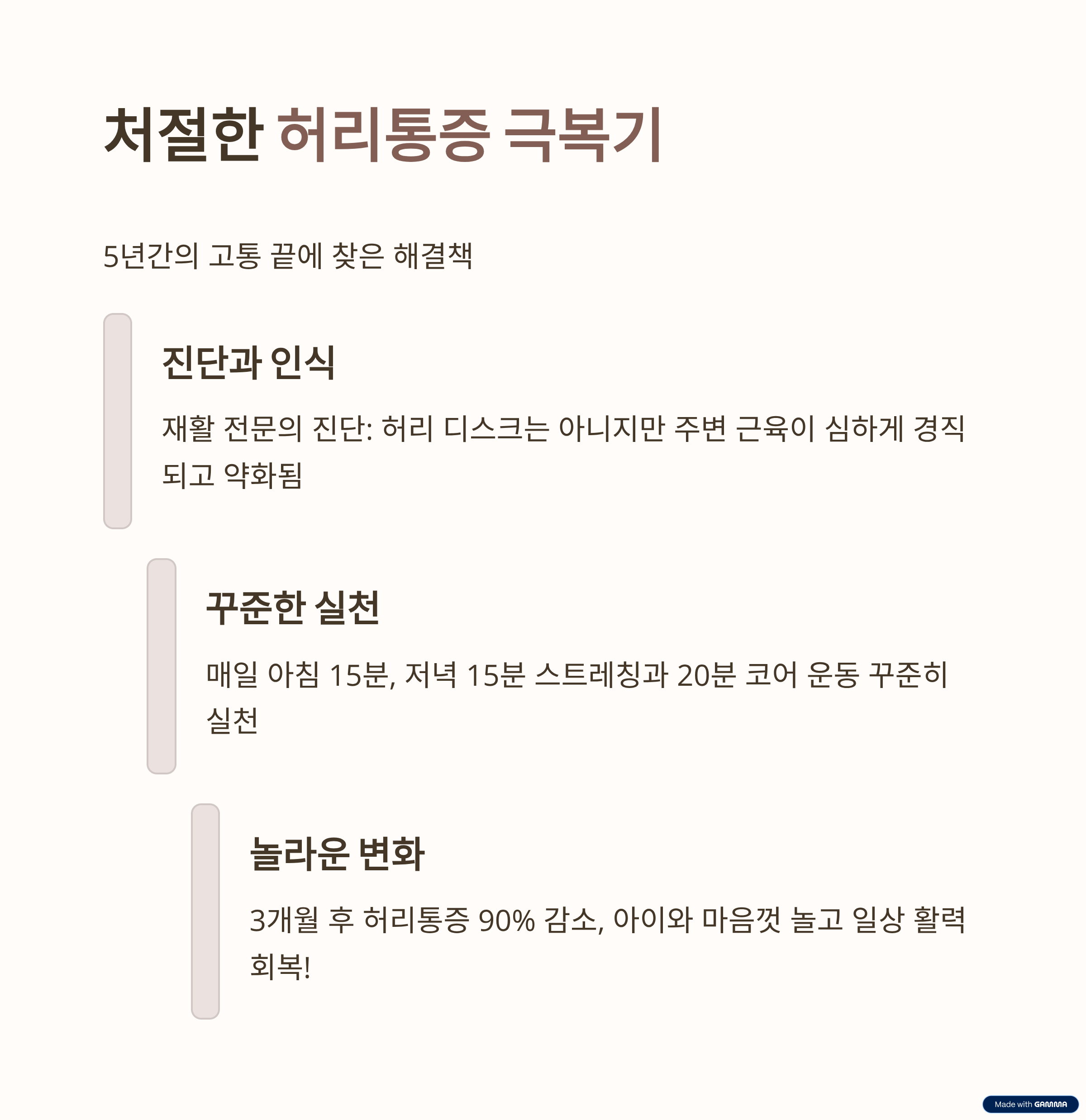 - 저는 5년 이상 만성 허리 통증에 시달렸지만, 꾸준한 운동과 자세 교정으로 허리 통증을 90% 이상 줄이고 일상생활의 활력을 되찾았습니다.
