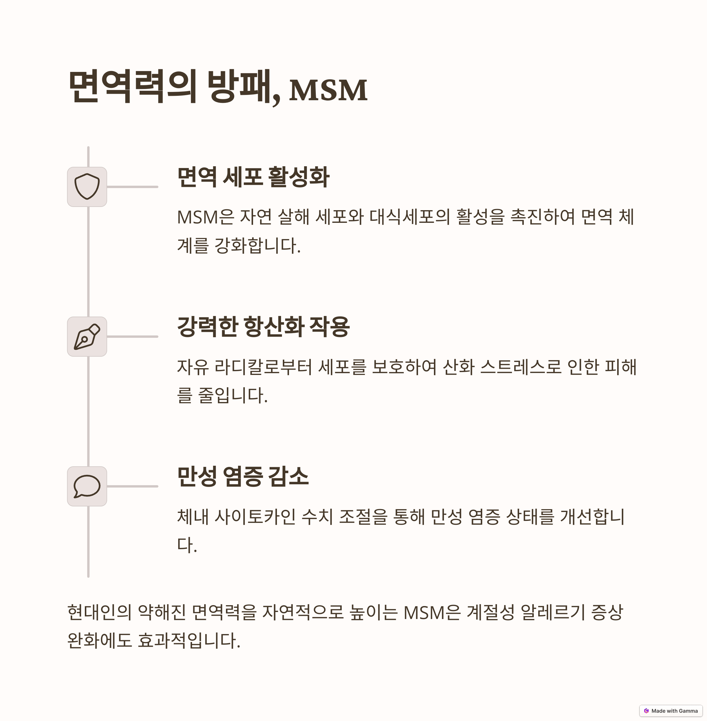 | 면역력 강화 | 면역 세포 활성을 촉진하고 면역 반응을 조절하여 면역력 강화에 도움을 줍니다. | ResearchGate - MSM and immunity |