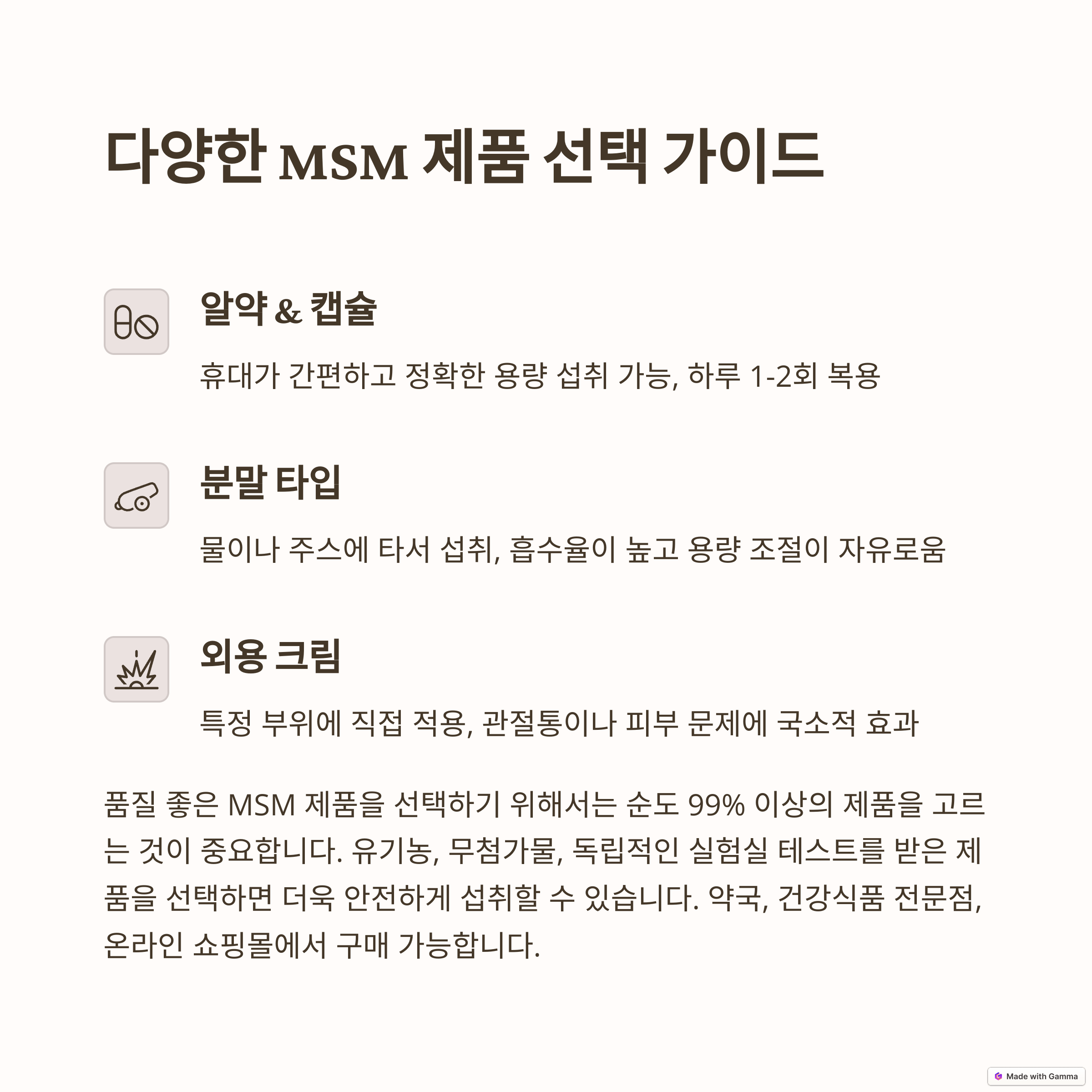 MSM은 흰색 결정성 분말로, 냄새가 없고 물에 잘 녹아 섭취가 용이합니다. 알약, 캡슐, 분말, 크림 등 다양한 형태로 출시되어 편리하게 섭취하거나 피부에 바를 수 있습니다.