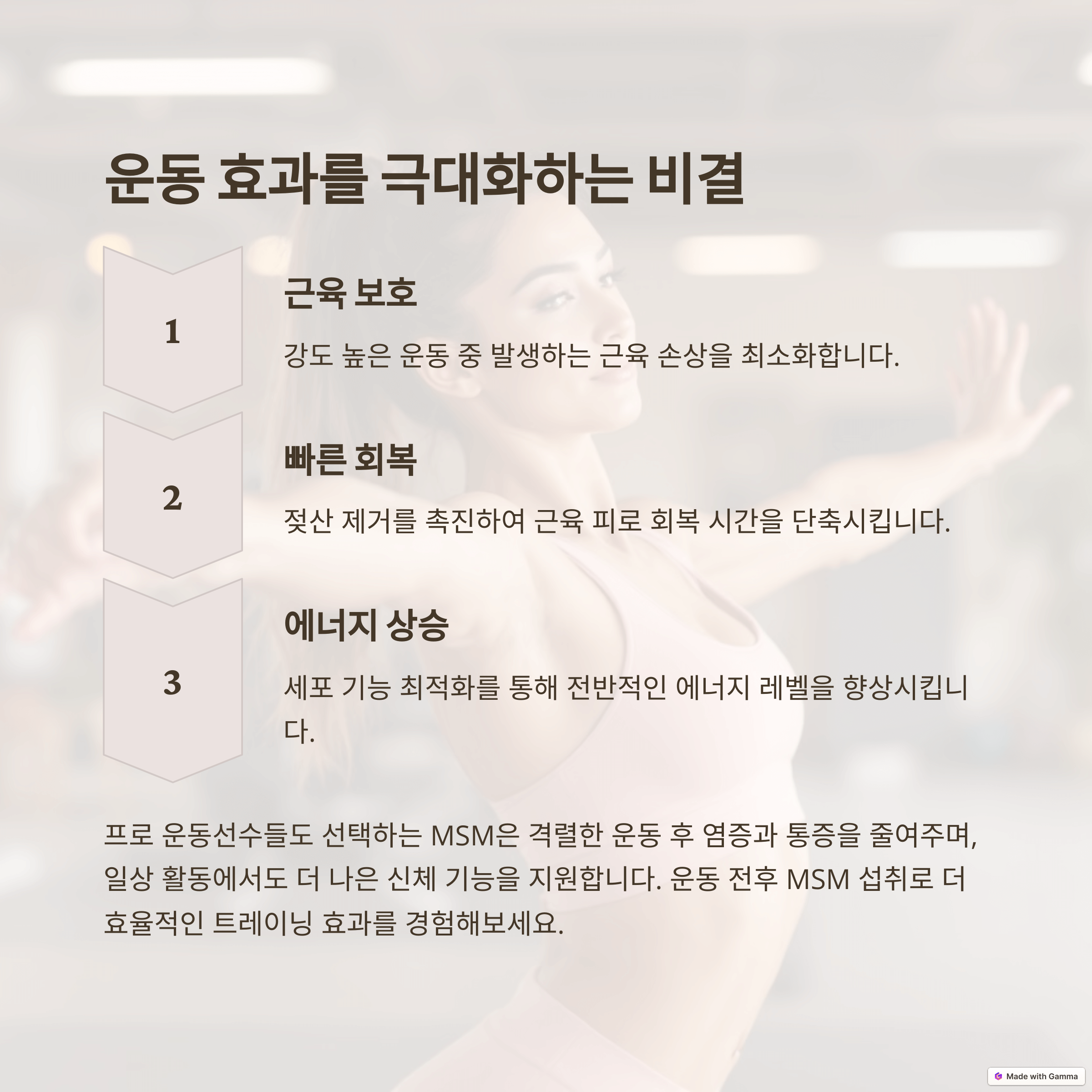 | 운동 후 회복 촉진 | 운동 후 근육 손상을 줄이고, 산화 스트레스를 감소시켜 빠른 회복을 돕습니다. | PubMed - MSM and exercise recovery |