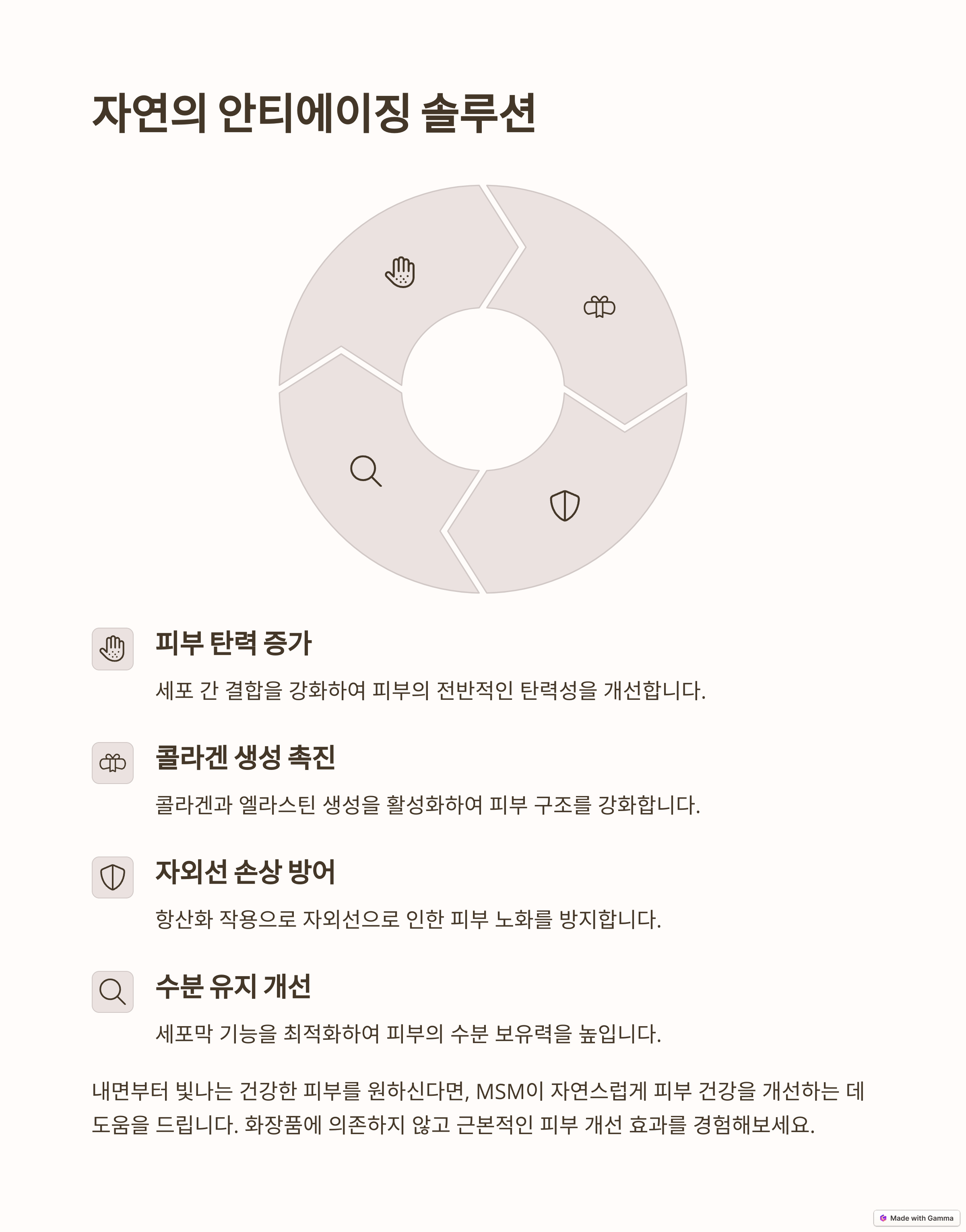 | 피부 건강 개선 | 콜라겐 생성을 촉진하고, 피부 염증을 줄여 탄력 있고 건강한 피부를 유지하는 데 도움을 줍니다. | PubMed - MSM and skin health |